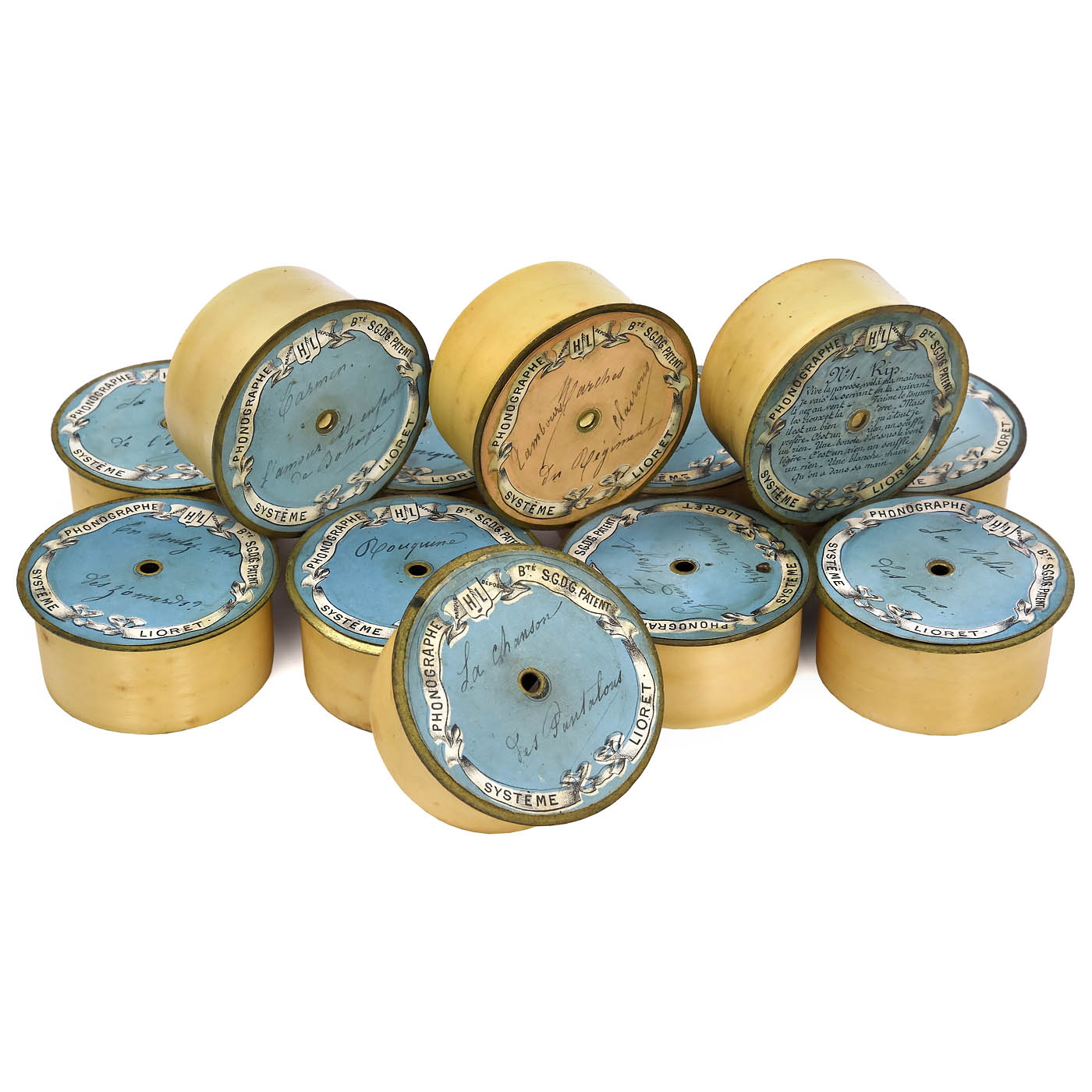 No. 694, invented and manufactured by Parisian clockmaker Henri Lioret (1848-1938), with nickel-plated brass case with Lioret name, spring motor, original reproducer, replaced horn, key and box with instructions on the front flap, good original playing condition, with twelve celluloid cylinders.