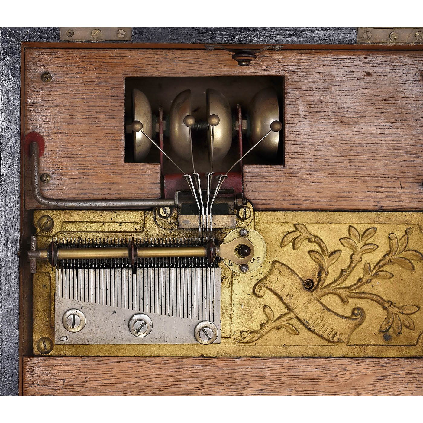Troubadour Musikwerke B. Grosz & Co., Leipzig. Model 44, for 8 7/8 -inch discs, 44 teeth in steel comb (complete), 4 optional saucer bells, with spring-drive and walnut case, good playing condition, with 2 discs.