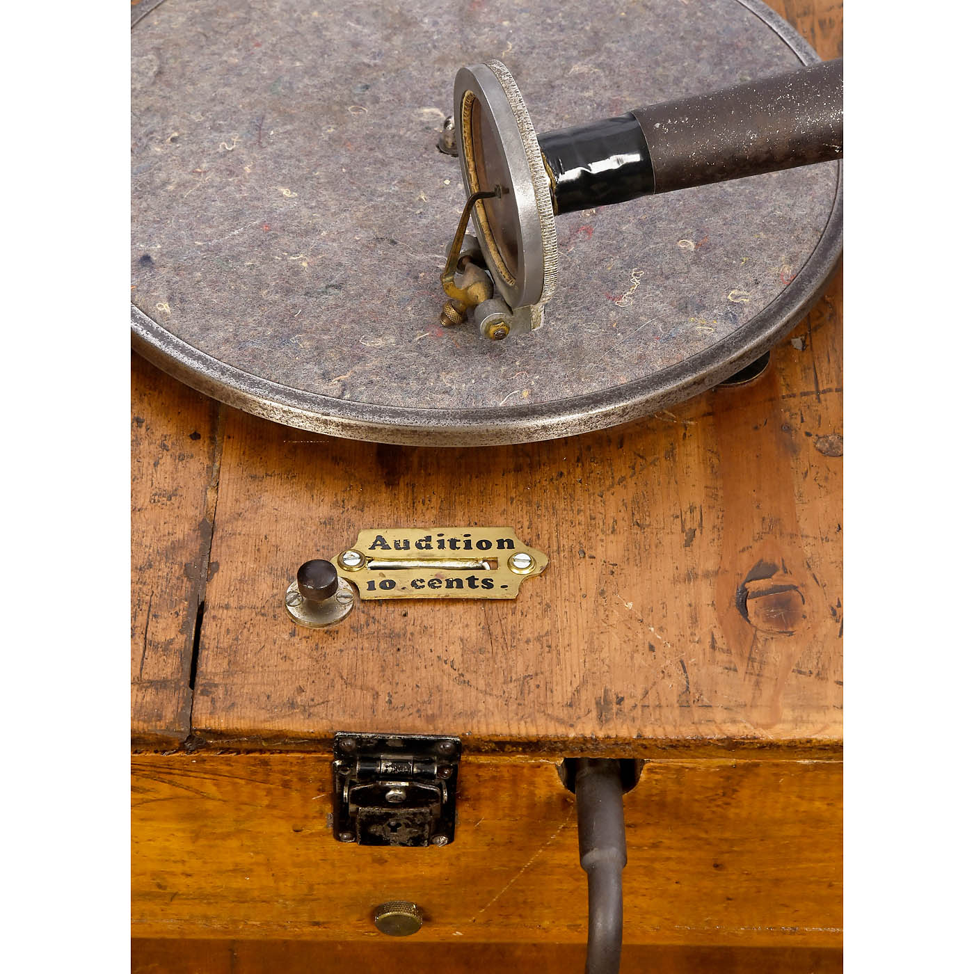 Le Concert Automatique Français No. 119, for vertically-cut discs, Pathé reproducer (missing sapphire), coin mechanism and spring motor working, large metal horn, overall height 80 in.