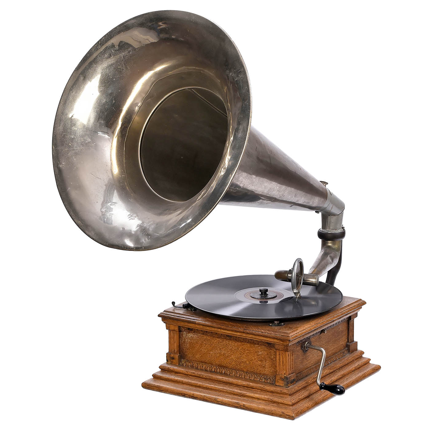 His Master's Voice, France. Oak case, nickel-plated horn, length 26 in., "Automatique Duplex" mica soundbox, 10 in. turntable, elbow added, motor with background noise, works.