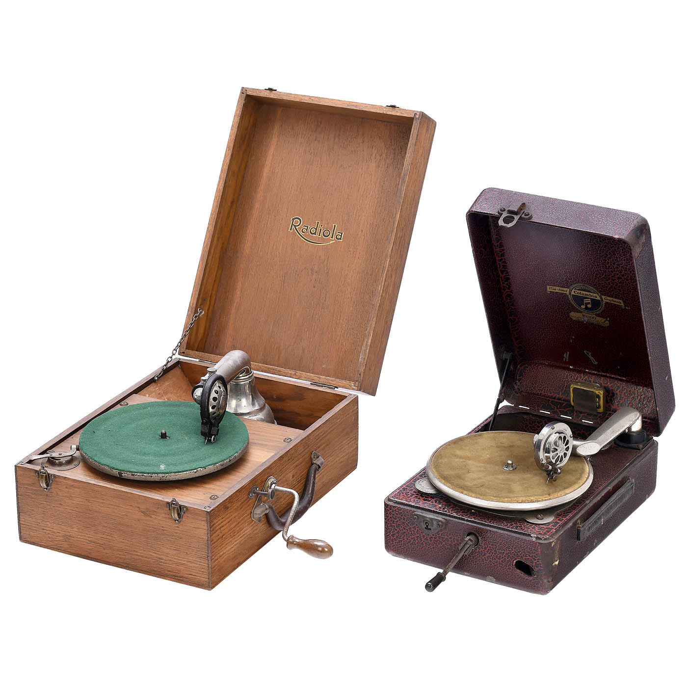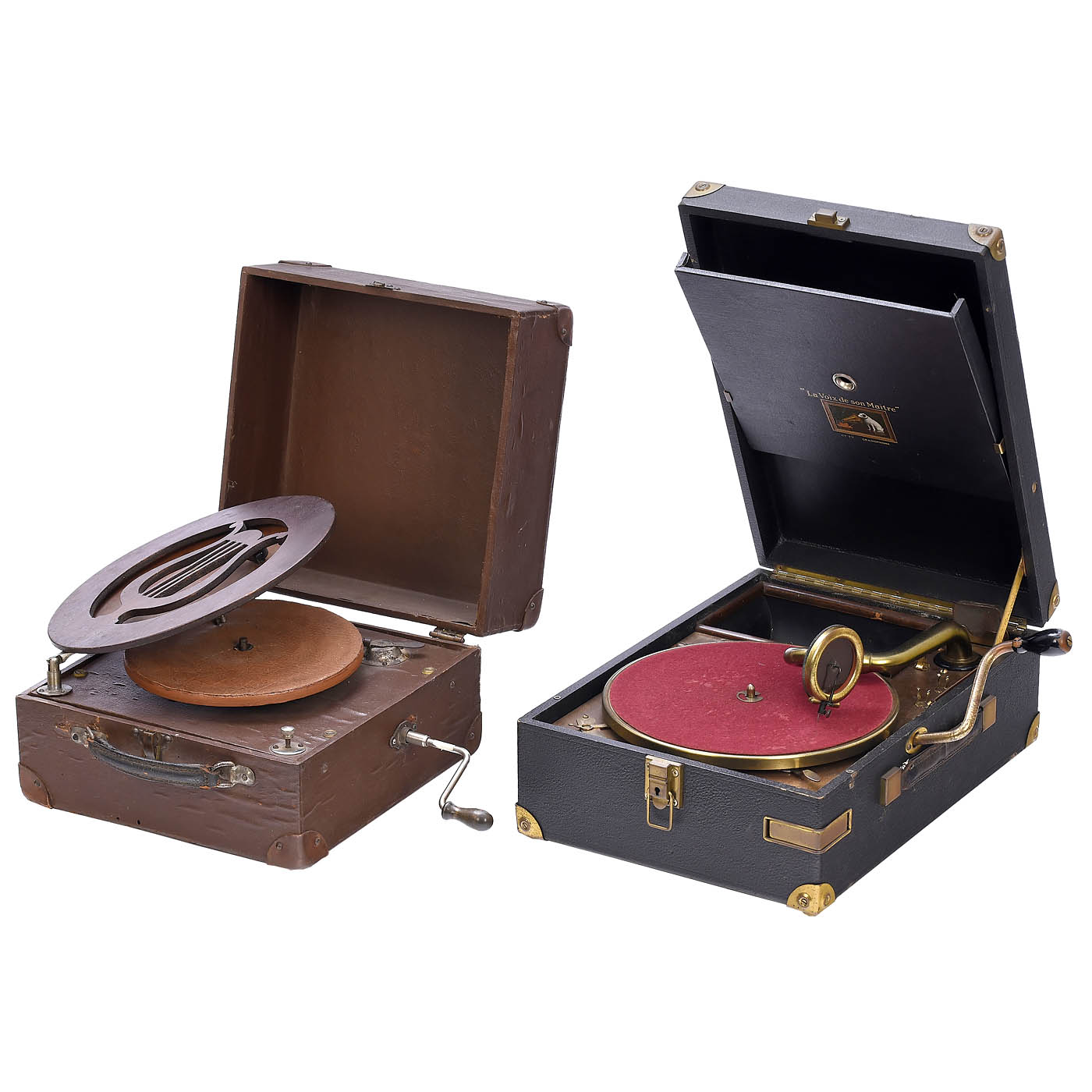 1) Columbia No. 100 Weekend, metal case with crackle varnish, HMV soundbox, original needle tin, folding crank, working but requires adjustment of the off switch and speed. - 2) Unmarked, with large paper diaphragm as loudspeaker, probably home-made. - 3) Radiola, wood case, reverse horn, Columbia soundbox, spring motor (works). - And: 4) La Voix de son Maitre, HMV France, gold-plated fittings, HMV No. 4 mica soundbox, works.