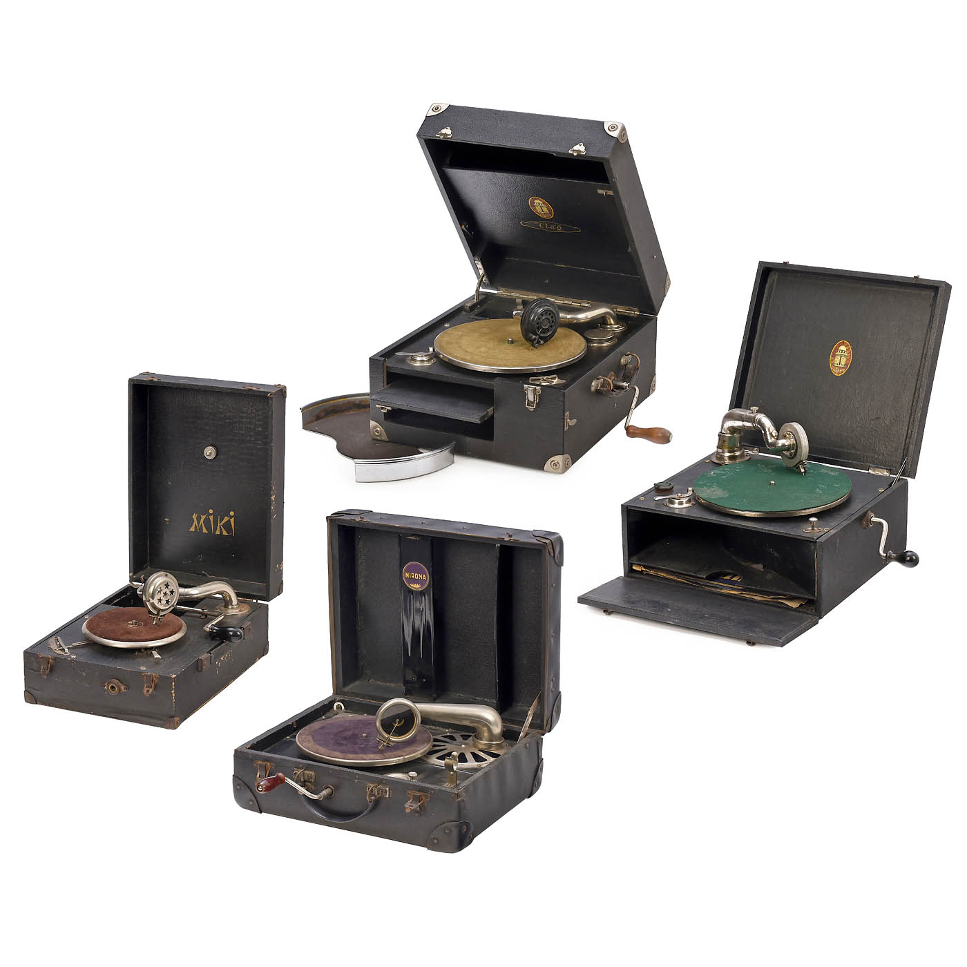 1) Nirona, with reverse horn, Nirona mica reproducer, disc compartment in lid, working. - 2) Odeon, detachable pick-up arm, record compartment in the lower part, spring motor (works), Odeon mica soundbox, pick-up arm bracket needs repairing, with 2 records. - 3) Odeon Claq, attachment for discs, adjustable flap in front of the horn, Odeon Scala 301 soundbox, spring motor (works). - And: 4) Miki, with 6-inch turntable, untested.