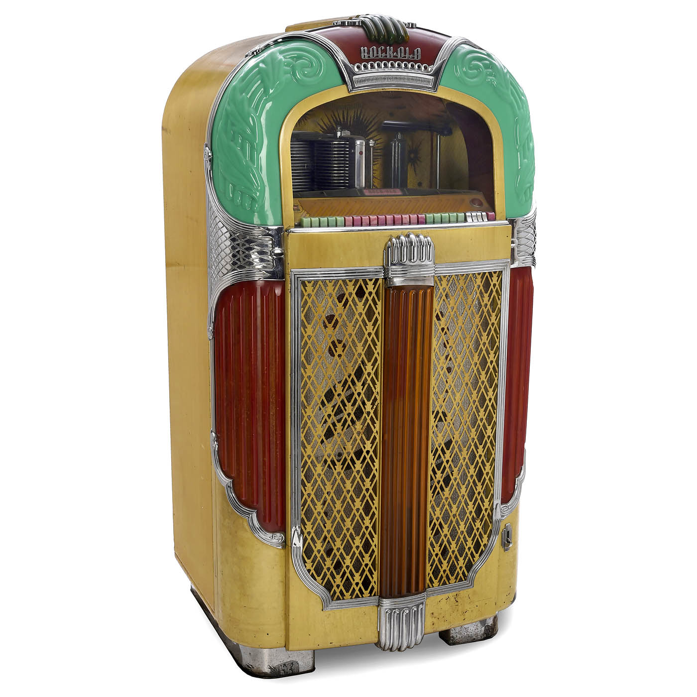 Rock-Ola Manufacturing Corporation, Chicago. For 78-rpm shellac records, with twenty selections, coin mechanism, illumination with 220 volts AC, mechanism and amplifier with 115 volts AC, 60 x 28 x 31 in., unrestored, no keys, mechanism needs repair.