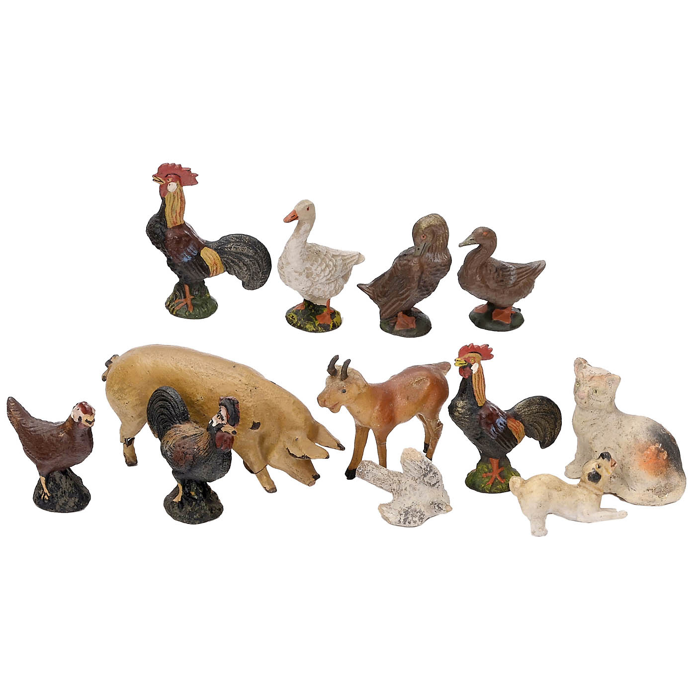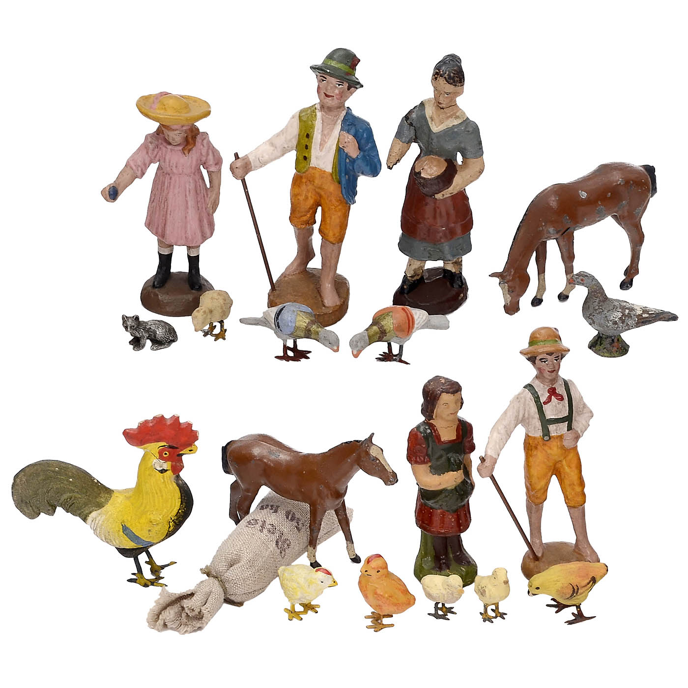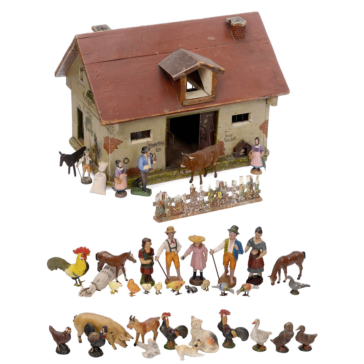 Stable building, wood, hand-painted, 4 sliding doors, many details, removable roof, total dimensions 21 2/3 x 14 ½ x 15 3/5 in., 36 figures (farmers, chickens, pigeons, horses, cows and other animals), manufactured by Elastolin, Lineol and others.