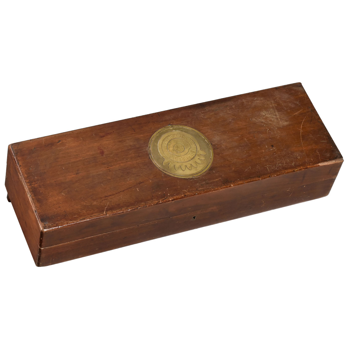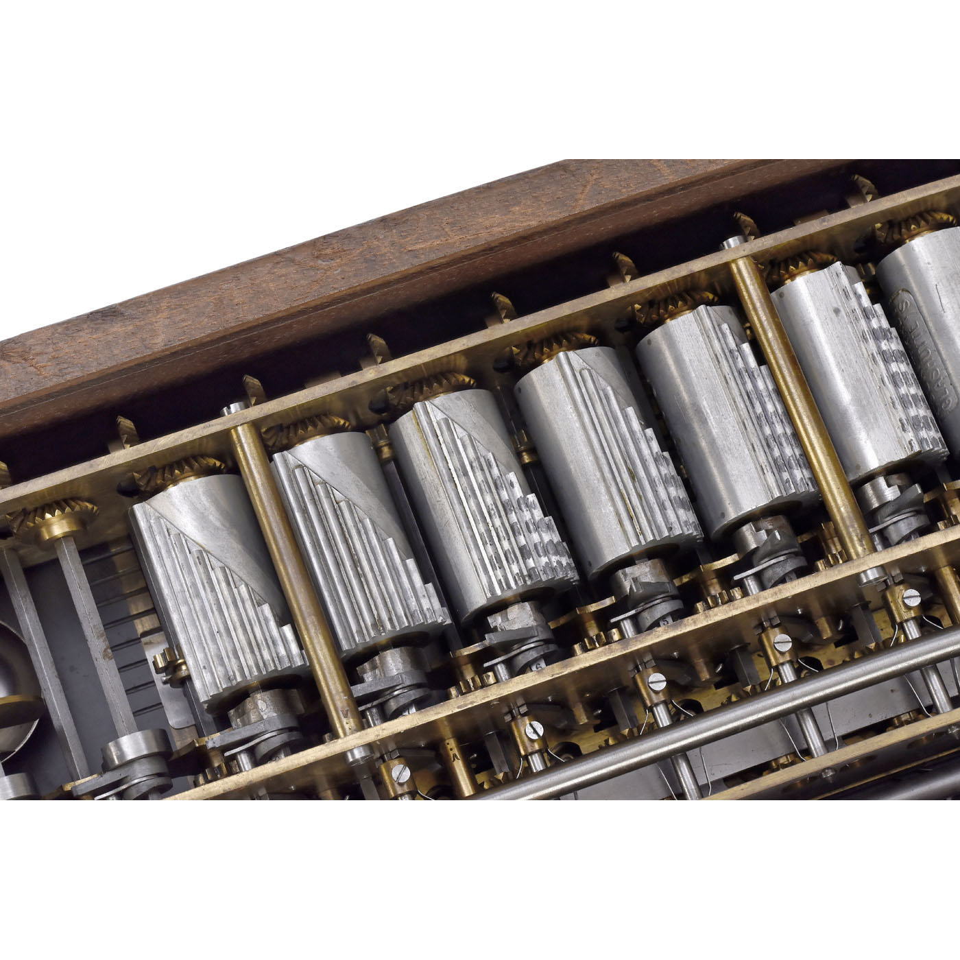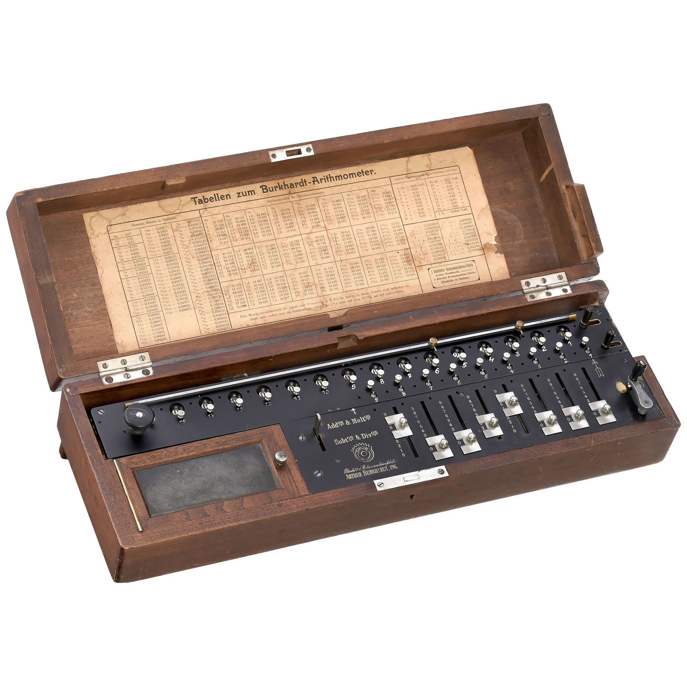Arthur Burkhardt, Glashütte. Mechanism with multiple stamps "8V", marked on lid "Burkhardt Arithmometer" (calculating machine), with 8, 9 and 16 digits, lever deletion, setting slides with small display windows, aluminum stepped drums with maker’s stamp, original tilting wood case and inner lid with original instructions on paper label, good optical and technical condition.- Literature: Martin, p. 82. – Note: The first German Thomas-type calculating machine.