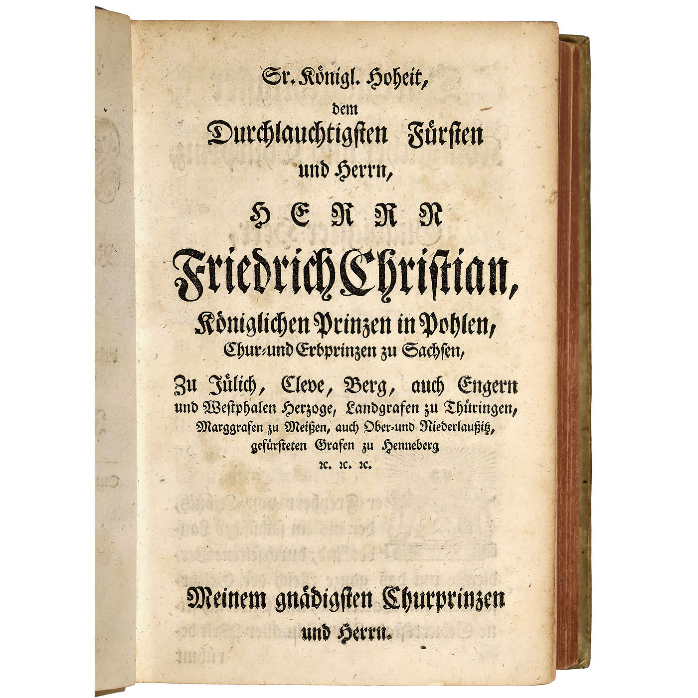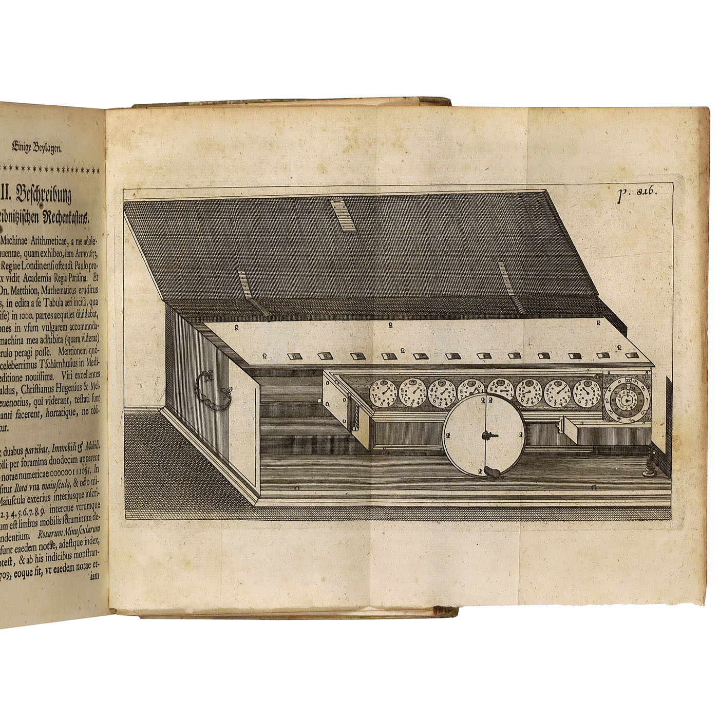 Theodicee, das ist, Versuch von der Güte Gottes, Freyheit des Menschen, und vom Ursprunge des Bösen, fourth edition 1744, publisher: Hanover and Leipzig, Nicol. Försters und Sohns Erben, improved and enlarged with various additions and annotations by Johann Christoph Gottscheden, 843 pages and several indexes, frontispiece with copper engraving portrait of the author, folded copper plate with depiction of Leibniz's calculating machine at the back of the book, contemporary goatskin binding, handwritten title on the spine, size 5 x 7 ¼ in. – Note: One of the most important treatises of the German Baroque period, first published in Latin. The basis of binary arithmetic and later digital computer science.