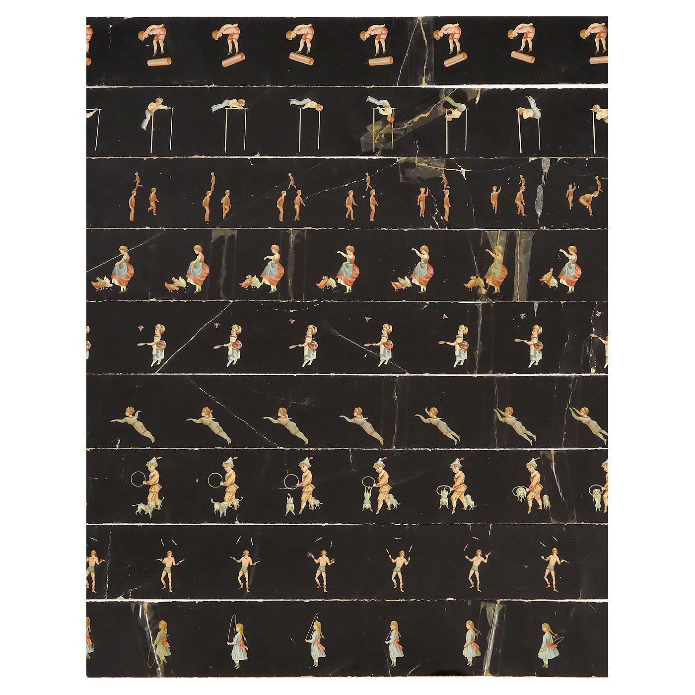 With 8 ½-inch (22 cm) diameter lacquered metal drum, candle-holder, original shade (one segment damaged) and labels, in mahogany case (split) with viewing window and card proscenium, wd. 9 ½ in. (25 cm), mirrors replaced, with nine strips (creases and adhesive repairs) and five good-quality photocopies of stage sets. – Note: An improvement of the zoetrope, Émile Reynaud’s praxinoscope from the early days of pre-cinema used a series mirrors with prism-like effect to create moving images without the typical 'flicker' associated with persistence of vision devices. – Literature: Brian Coe, "The History of Movie Photography", p. 35.