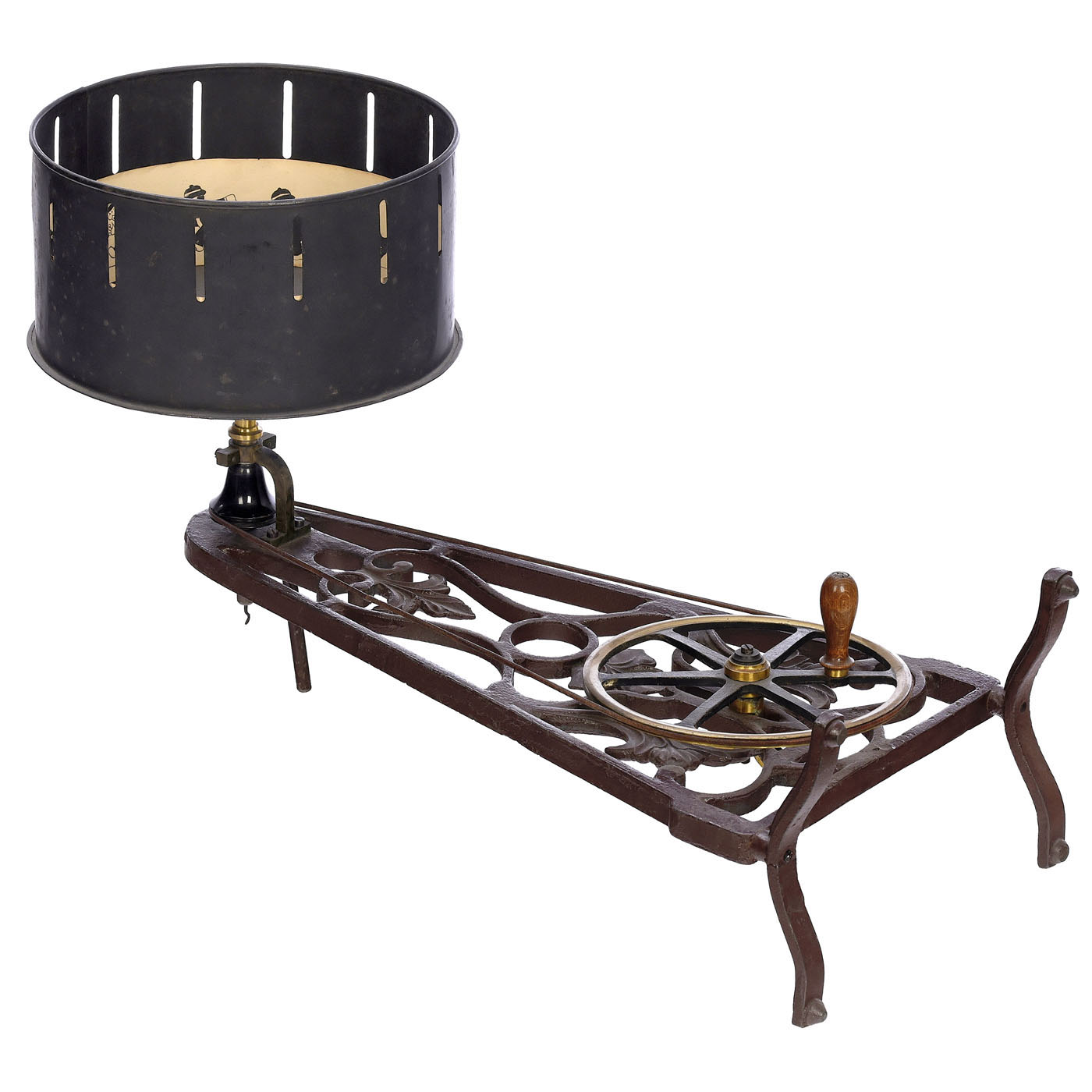 Unmarked, with 24.5 cm diameter metal drum on a cast-iron frame, original drive-belt, crank for high-speed operation, clamp to secure picture strips at both ends, lg. 57 cm, with three matching picture strips and three more original strips that are somewhat too long for the clamp, two strips with original seven motifs instead of the usual fourteen, but the view to these two strips when turning may be better depending on your eyesight. – An excellent exhibit!