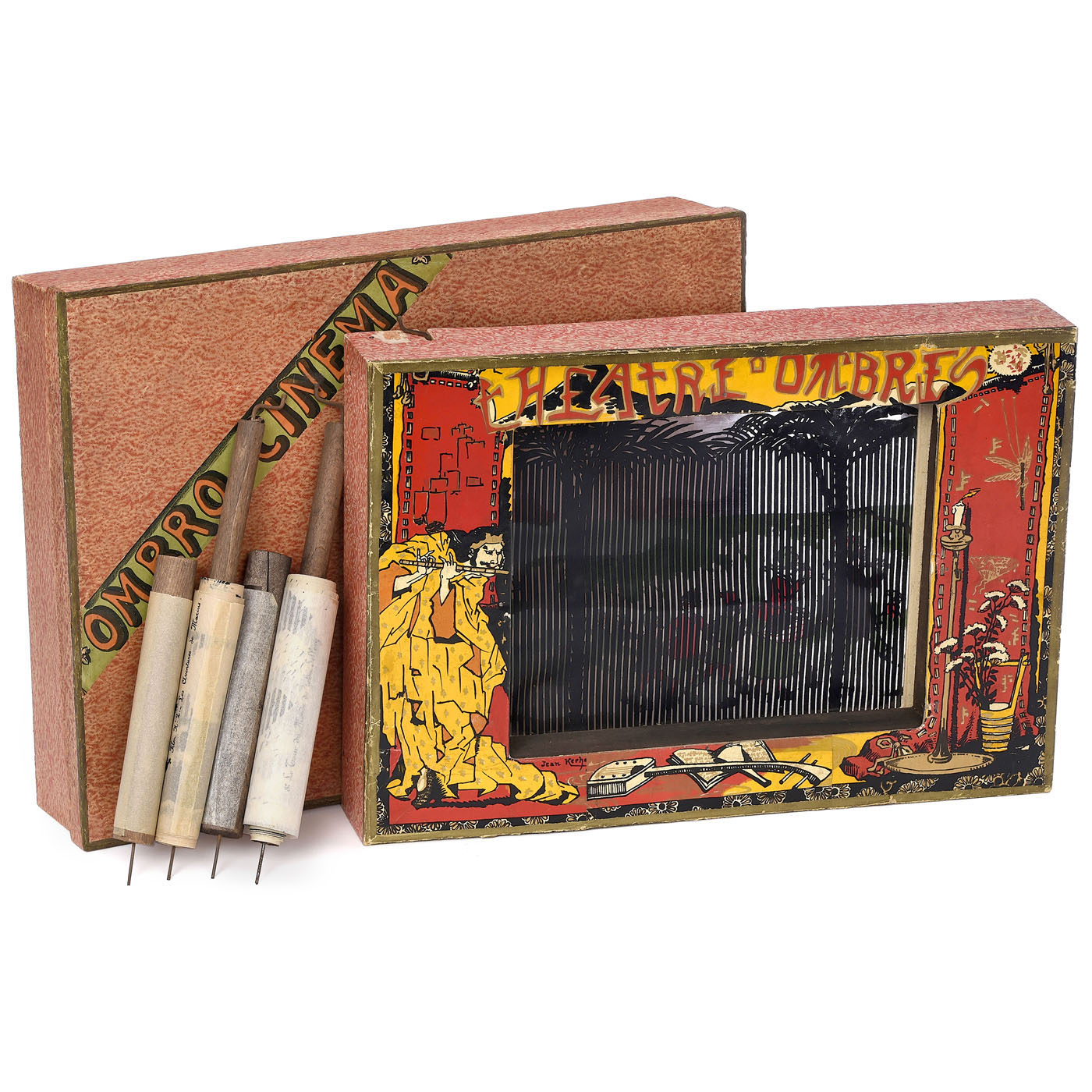 France, optical viewing device for "moving" sequences in a strip panorama, with paper roll driven by a small cylinder musical movement, stage-form setting with legend "Theatre Ombre" and original box with instructions in lid, 46 x 33 cm, overall good condition, musical movement working but spring weak. Rolls: No. 20, colored, "Histoire du Petit Poucet"; Film No. 2, black-and-white "Les aventures du Marius" (1–10); and Film No. 8, black-and-white, "Le Tour du Monde de John Sellery" (1–12), tear professionally repaired in one place, small, insignificant tears in two others. – Literature: Ariel Cine Register 555.