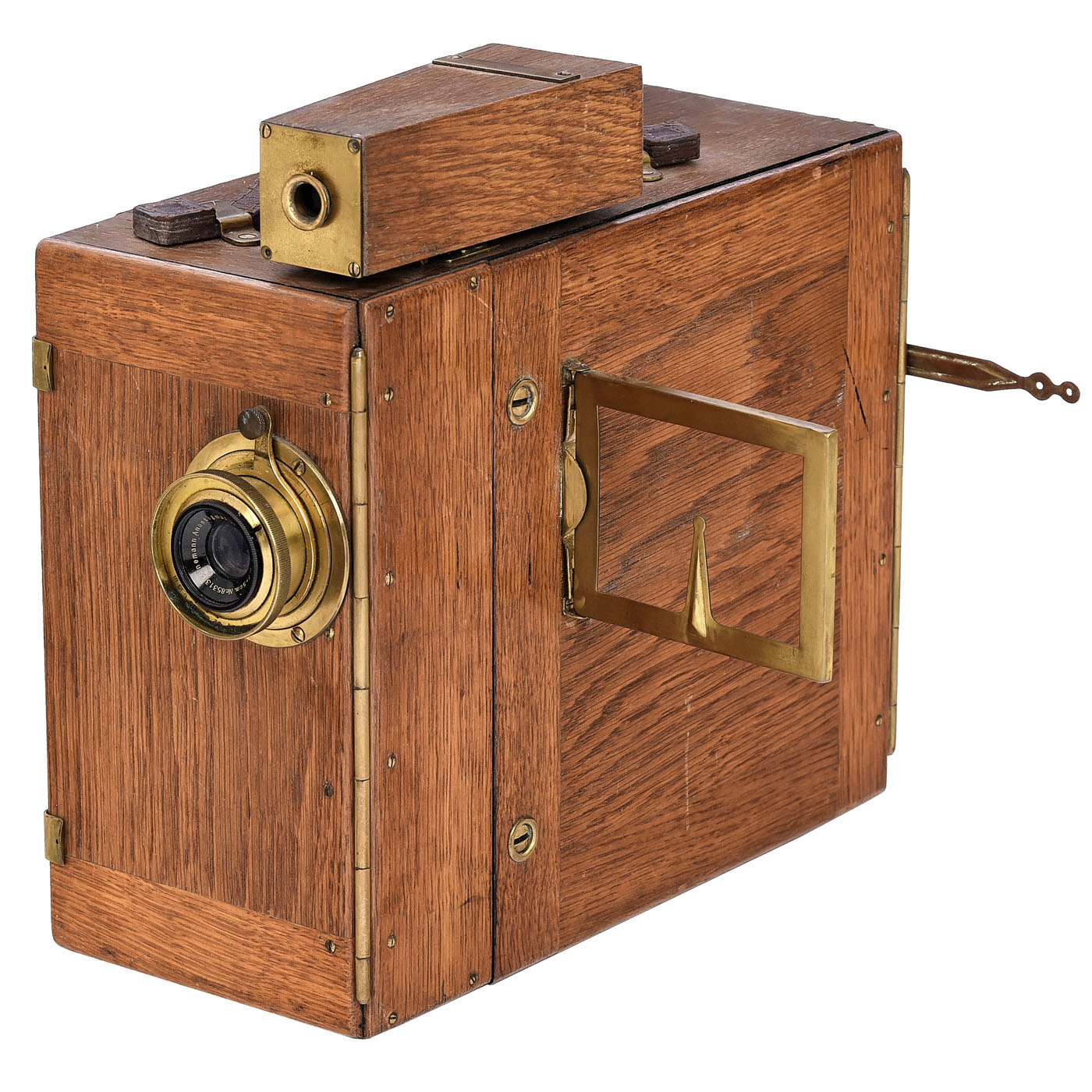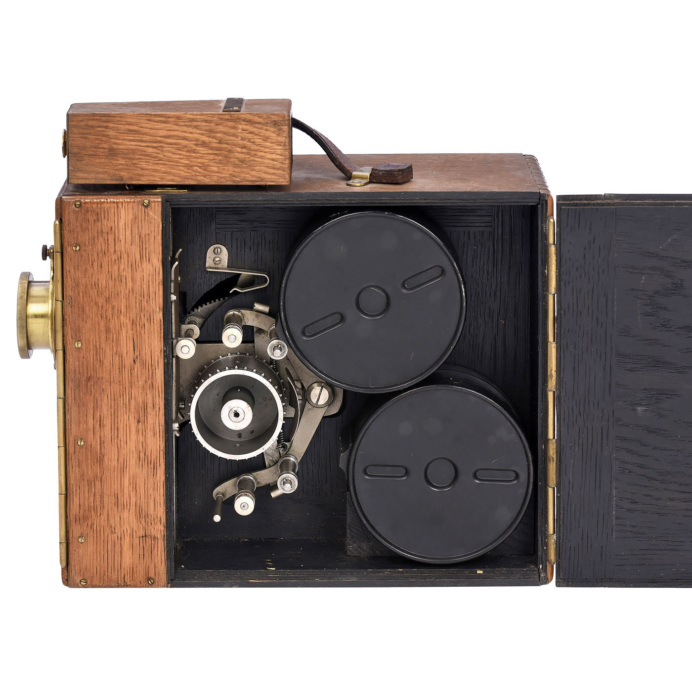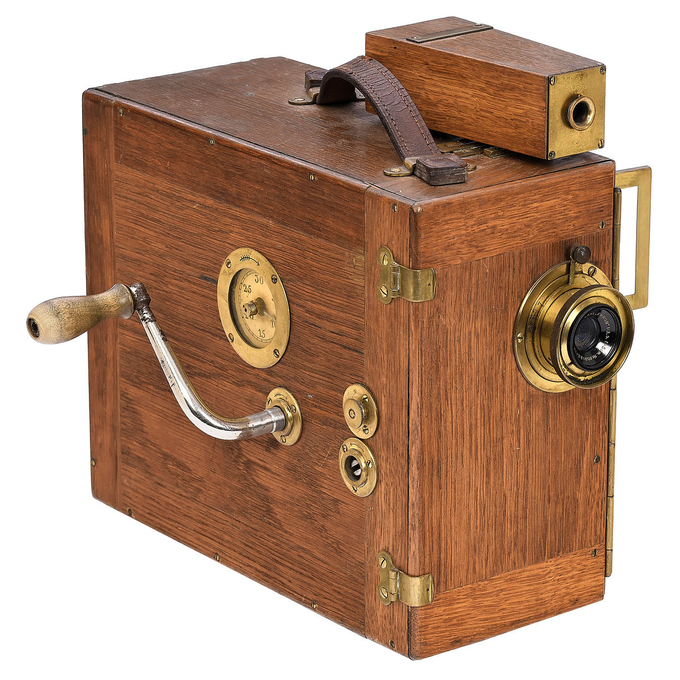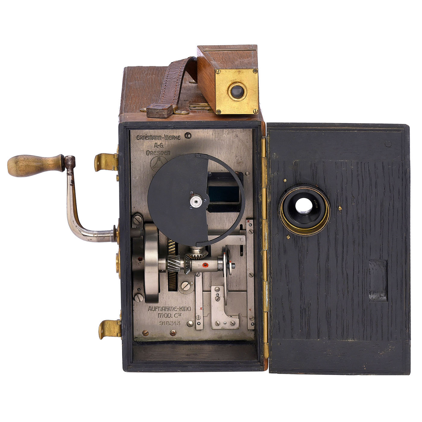 Ernemann A.G., Dresden. For 35mm film in Ernemann 35-meter (max.) metal cassette, with hand-turned eight-speed double-claw transport mechanism, Ernon 3.5/50 mm lens, wood case, attached ground-glass viewfinder with inverted image, additional folding viewfinder in brass frame and lockable slot under the viewfinder for additional use as a copying machine. An early German motion picture camera.
