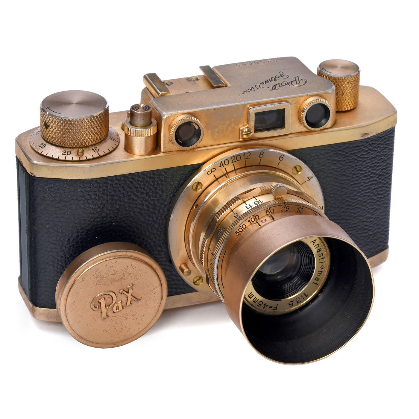 Yamato Koki Camera, Tokyo. No. 58440, deluxe version of the "PaX", green leather, with Luminor Anastigmat 3,5/45 mm, shutter 1/10–1/300 sec. (too slow), coupled rangefinder, golden sunshade with green leather case and PaX emblem, PaX cap, leather-covered back with some abraisons, rangefinder with minor inaccuracy, overall good condition. – One of the most attractive Leica copies.
