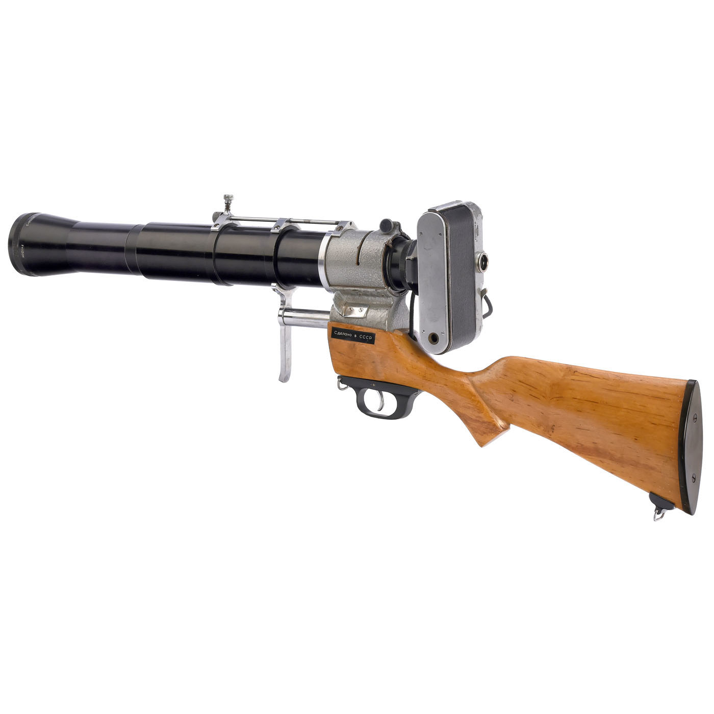 KMZ, USSR. Crystal No. 61022994, SLR for 24 x 36 mm, with grey hammered paint effect, rifle mount in corresponding finish and an indirect zoom lens, shutter working. – Note: A scientific rifle camera for Unusual Flickering Objects that would otherwise appear blurred. The camera was presumably built as a prototype for scientists in Akademogorodok, to document insects or plants quickly, conveniently and undisturbed, as well as for researchers who need to focus objects far beyond infinity (optical cloaking) and are not disturbed by the inverted image in the reflex viewfinder. The camera is fitted with an indirect zoom lens, the negative element is fixed and there is no structural focusing option. The only movable part is the positive element, a Petzval type 2/12 cm no. 063270, which is far away from it. It is the only element that controls the lens by means of the stroke of the slide rod (51 mm stroke). Without stroke, the macro range is 1:1 at a distance of 65 cm from the front lens. With a stroke of 28 mm, infinity is reached with a focal length of approx. 500 mm. Then, structurally, there is a further stroke of up to 23 mm for considerable scope far beyond infinity, more than any known infrared index. Due to its design, the lens aperture is at its weakest at infinity; at close range the light intensity increases significantly due to the shortening of the focal length. The addition of an iris diaphragm is unnecessary. The image quality (checked with a strong magnifying optics in the film window) is of high color purity and sharpness.