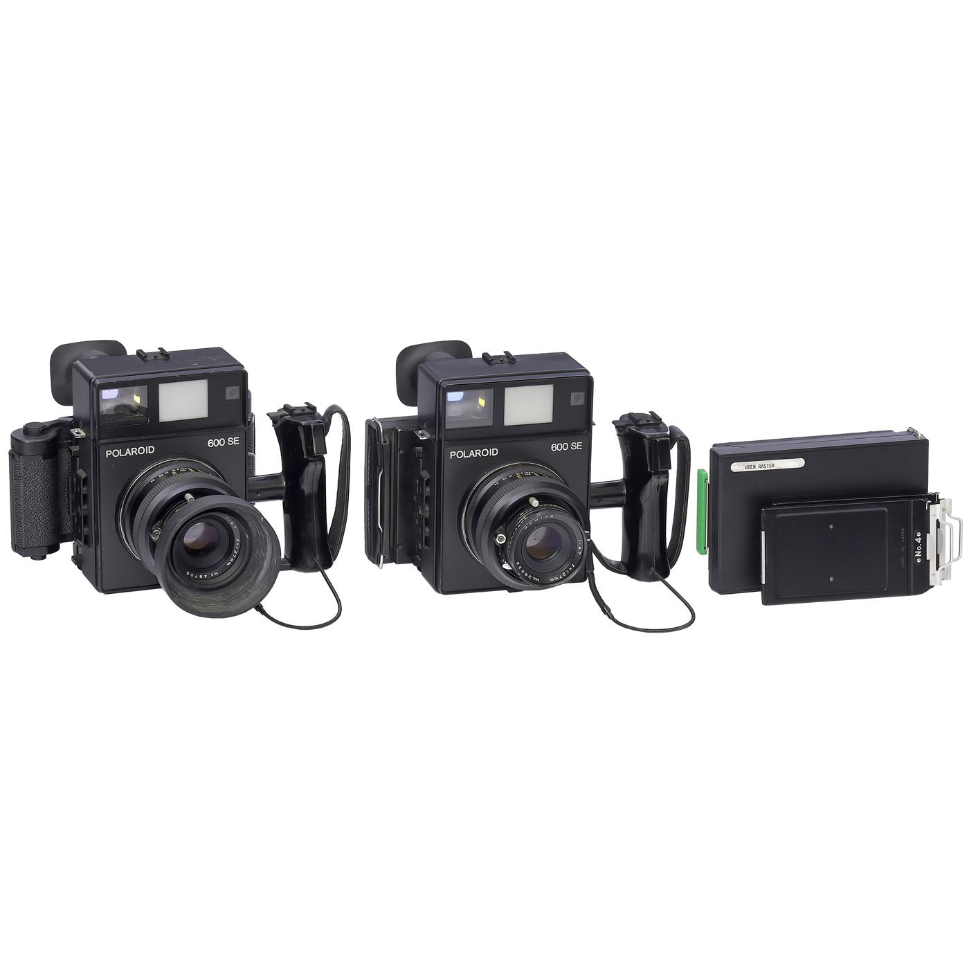 Polaroid-Mamiya, Japan/USA. Shutters and rangefinders working, both lenses with dust when viewed under point light. 1) Polaroid 600 SE, interchangeable lens Mamiya 4.7/127 mm, with Mamiya press rollfilm holder for Polaroid 600 SE. (3–4/3) – 2) Mamiya rollfilm magazine 6 x 7 cm, and 2 cut-film holders for 6.5 x 9 cm formats. (2-/3) – And: 3) Polaroid 600 SE with Mamiya 4.7/127 mm and 2 Polaroid Model 73 pack-film holders. (3/3)