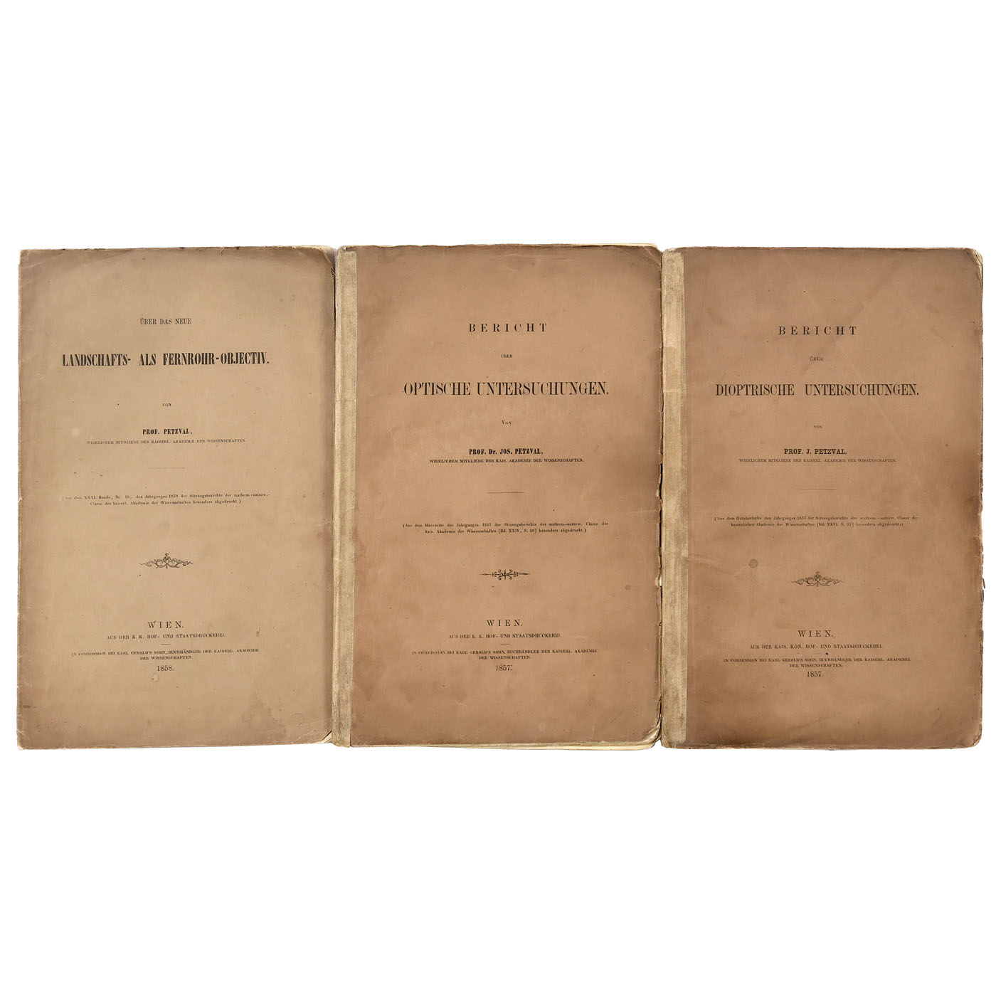 Professor Joseph Petzval, founder of the calculation for photo lenses, text in German. 1) "Report on Optical Investigations" (from the March 1857 issue of the "Academy of Sciences", Vol. XXIV, p. 50, printed separately), Vienna 1857, with the 2nd and 3rd continuations, 58 pages in total, announced at the meeting on March 12, 1857. – 2) "Report on Dioptric Investigations" (from the October 1857 issue of the "Academy of Sciences", Vol. XXVI, p. 32, printed separately), Vienna 1857, 60 pages, presented at the meeting on July 23, 1857, a lecture for photographers who want to learn what a lens is. – And: 3) "On the New Landscape Lens as a Telescope" (from the XXXI. Volume, No. 18 of the "Academy of Sciences", printed separately, Vienna 1858, 15 pages. Quote: "I do not believe that since the first beginnings of practical optics any article has ever provoked such a violent, rebellious movement among optical artists as this lens. It had barely been published when it had already found a significant number of imitators, and the imitators had found more imitators... the army of imitators has already got into a fight in the various European journals, and one says as many spiteful things about the other as he can find... yet it hardly befits the scientific man to pour out harsh criticism... rather, it falls on him to protect the interests of science in this colorful ecstasy..." – Joseph Petzval explains to users of this lens in great detail how to adjust the sharp focus to one with an improved effect of depth by changing the distance. Quote: "… every photographic artist who has diligently studied the new lens and learned its peculiarities will be able to obtain as much depth of focus as he needs by changing the distance." – Two centuries later, these three treatises are still relevant for today’s optical engineers, especially since the freshness and directness of Petzval’s language illuminates the effects of ignorance and prejudice on people’s minds. Historically valuable resources.