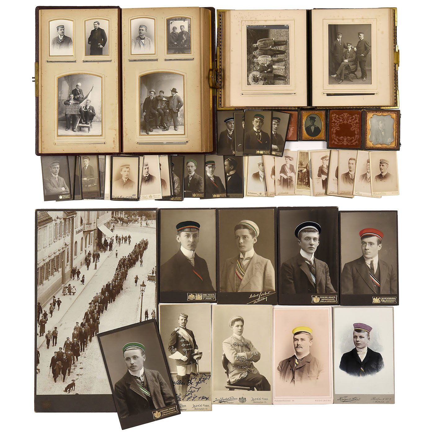 Early and rare images of students, mostly with the name noted on reverse: 1) Daguerreotype in an 8 x 9.5 cm case decorated with symbols of freedom. – 2) Ferrotype in 6 x 7 cm case. – 3) Album, 20 x 23.5 cm, with 21 plates for cabinet photographs, with 24 photographs. – 4) Red leather album, 20 x 34 cm, with dedication from 1903, with 14 plates, each intended for two cartes de visite and a cabinet card, almost completely filled. – And: 5) Collection of 48 cartes de visite and a 13.5 x 22 cm photograph of a parade, with detailed hand-tinted hats. – Note: The Burschenschaft (see https://en.wikipedia.org/wiki/Burschenschaft) were formed in the course of the wars of liberation c. 1815 and campaigned for reforms at universities and in the state. They were against the bullying of younger students and set strict rules against the custom of dueling. They were often banned because of their overly democratic tendencies, and even National Socialism failed in its efforts to bring them into line. – Rare image material on political freedom of expression.