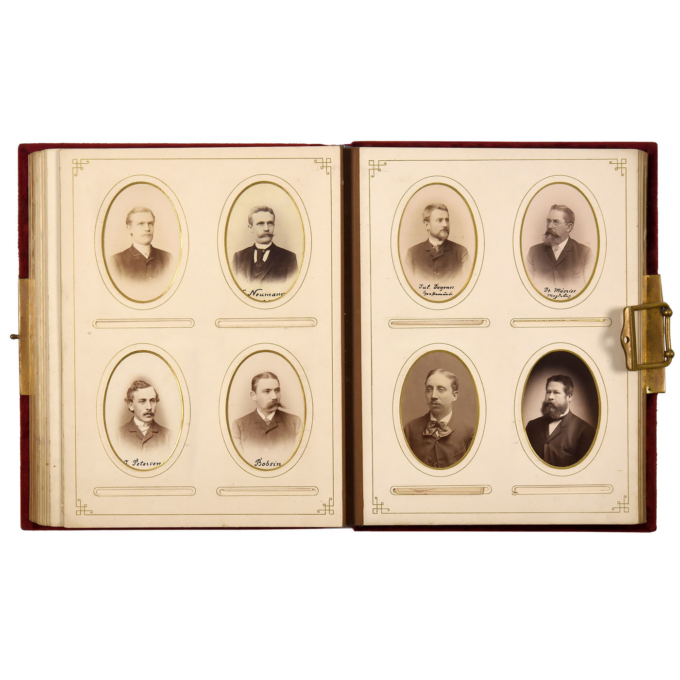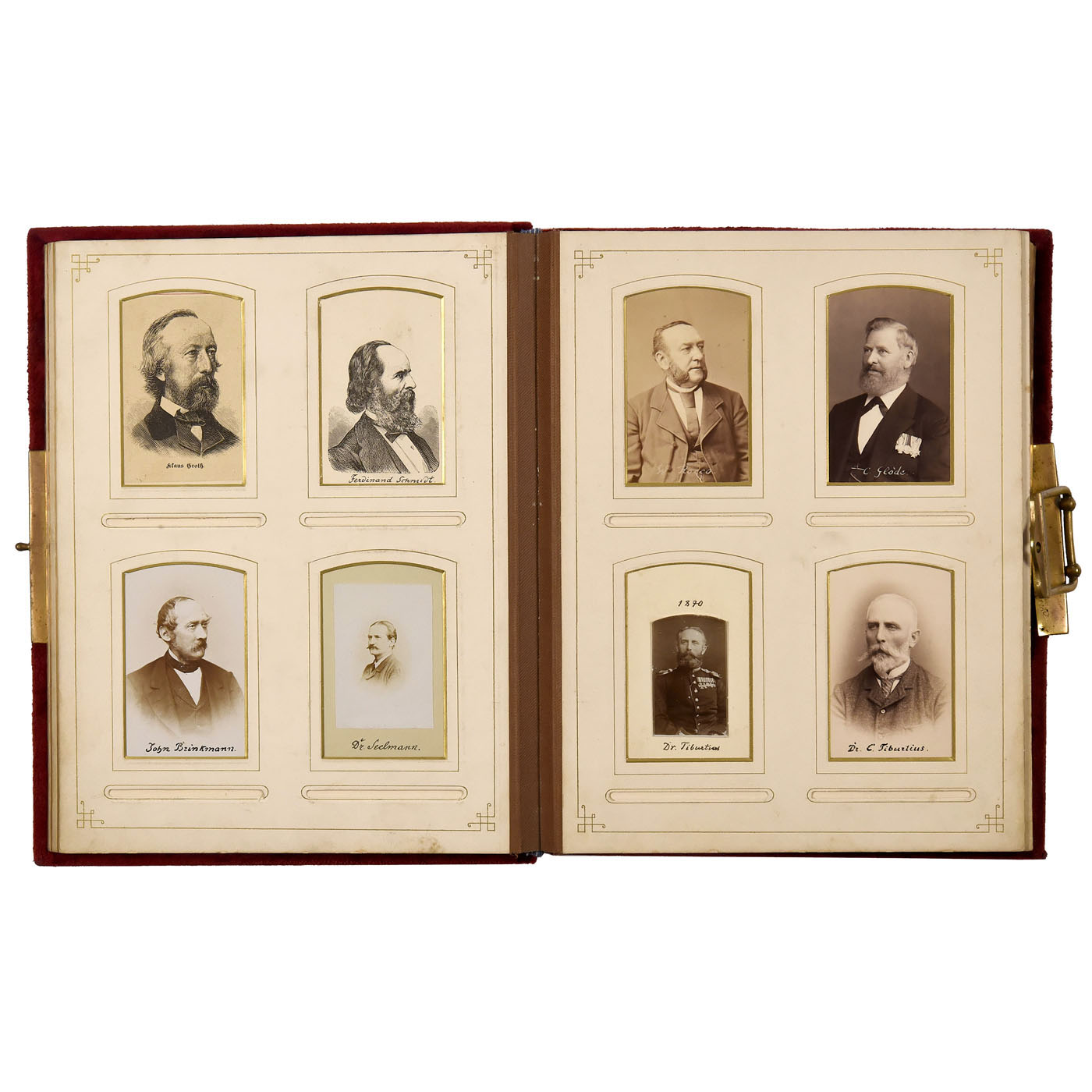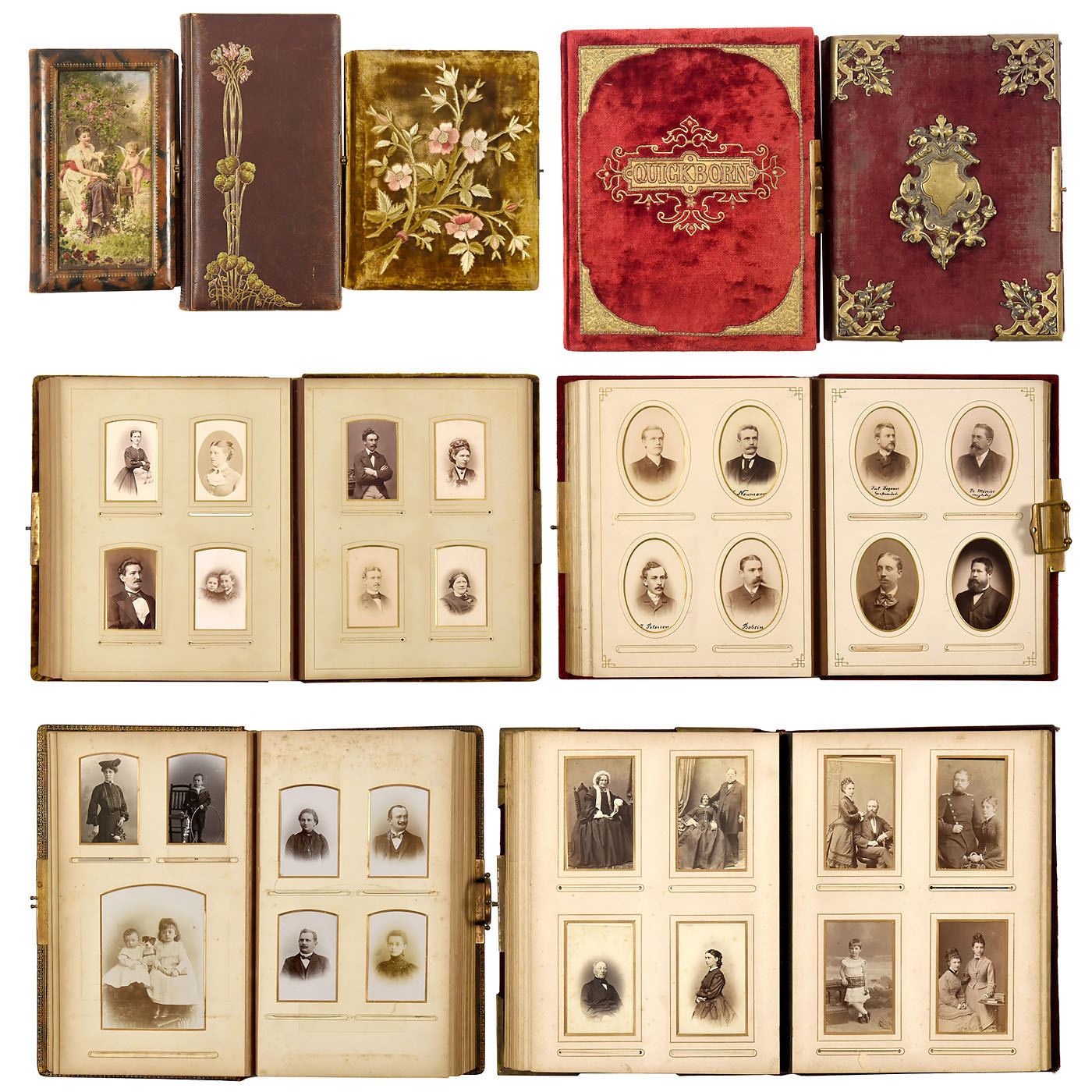 1) Leather album, 21 x 35 cm, with chromolithograph of Cupid sharpening arrows on the front, 14 plates for cartes de visite and cabinet cards, completely filled, some tears, with clasp. (3-/–) – 2) Velvet album, 27 x 34 cm, with floral embroidery on the front, 16 plates for cartes de visite and cabinet cards, completely filled, clasp missing. (3/–) – 3) Velvet album with elaborate embroidery on front, in linen-covered box marked "Quickborn", with 17 plates for cartes de visite and cabinet cards, containing photographs of the Talman Jahnke, Post and other families, many images inscribed, clasp loose. (3-/–) – 4) Velvet album with vacant brass cartouche, 16 plates for cartes de visite and cabinet cards, filled, some tears, clasp missing. (3–4/–) – And: 5) Vacant Art-Nouveau album with floral decoration, 23 x 42 cm, with 14 plates for cartes de visite and cabinet cards. (2–3/–)