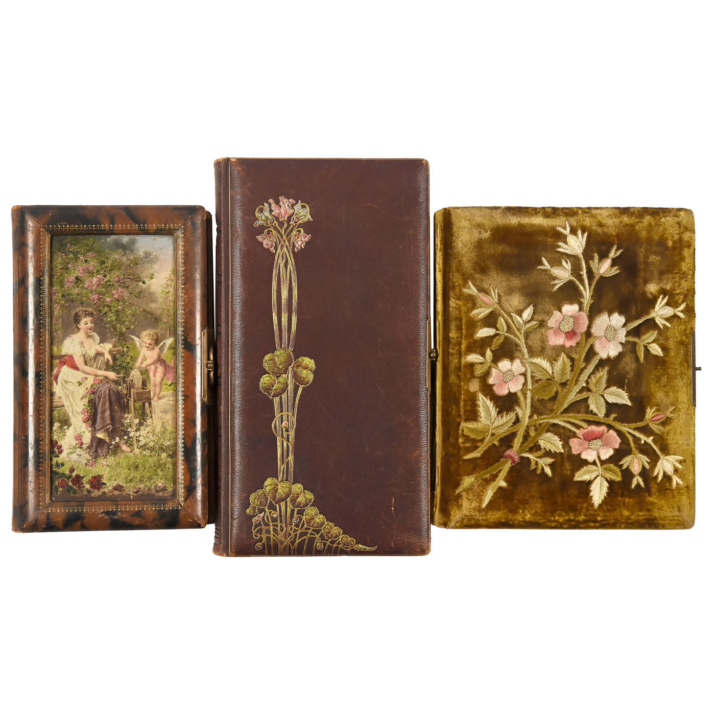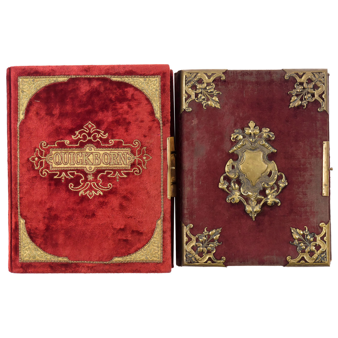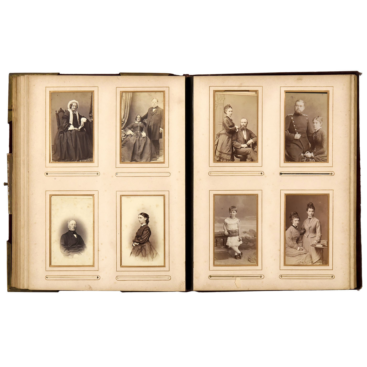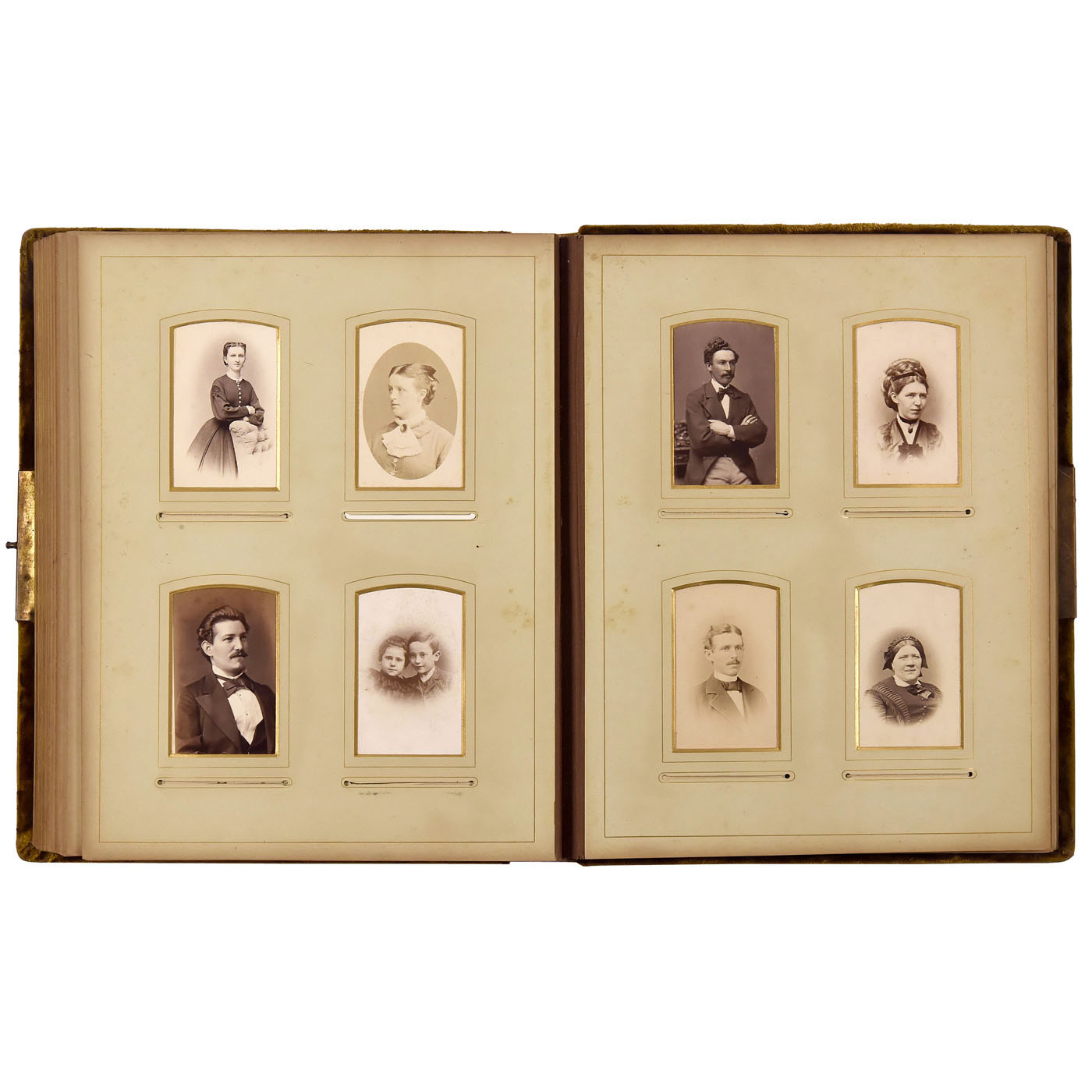 1) Leather album, 21 x 35 cm, with chromolithograph of Cupid sharpening arrows on the front, 14 plates for cartes de visite and cabinet cards, completely filled, some tears, with clasp. (3-/–) – 2) Velvet album, 27 x 34 cm, with floral embroidery on the front, 16 plates for cartes de visite and cabinet cards, completely filled, clasp missing. (3/–) – 3) Velvet album with elaborate embroidery on front, in linen-covered box marked "Quickborn", with 17 plates for cartes de visite and cabinet cards, containing photographs of the Talman Jahnke, Post and other families, many images inscribed, clasp loose. (3-/–) – 4) Velvet album with vacant brass cartouche, 16 plates for cartes de visite and cabinet cards, filled, some tears, clasp missing. (3–4/–) – And: 5) Vacant Art-Nouveau album with floral decoration, 23 x 42 cm, with 14 plates for cartes de visite and cabinet cards. (2–3/–)