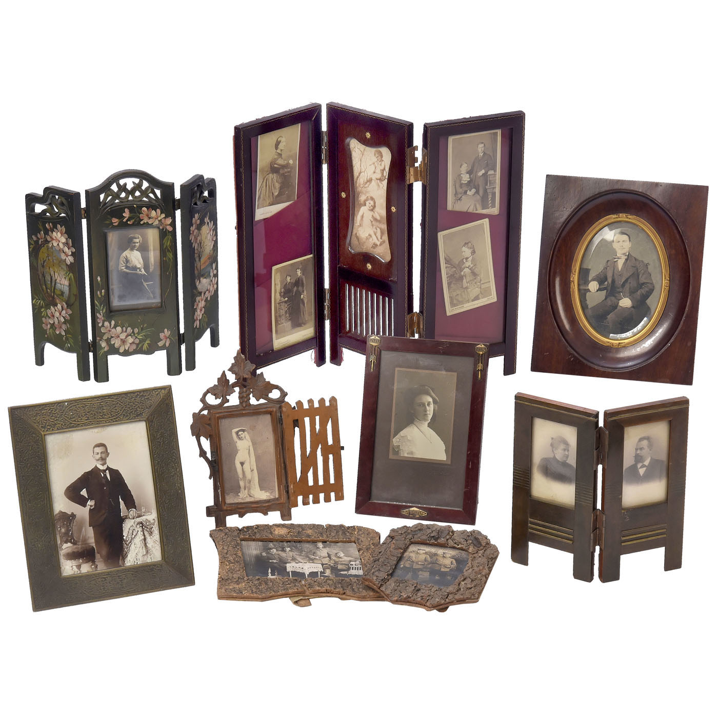 A carefully assembled study collection of 33 frames, from luxury frames to frames created from bark in the trenches of World War I. Many variants are represented, including folding screen frames, mixed but mostly in good condition. – Note: Looking at this variety raises the question of whether the inimitable fidelity of the portrait leads the person being photographed to choose an external mirror of their unconscious as a frame for their likeness. An important aspect of the history of the photographic studio.