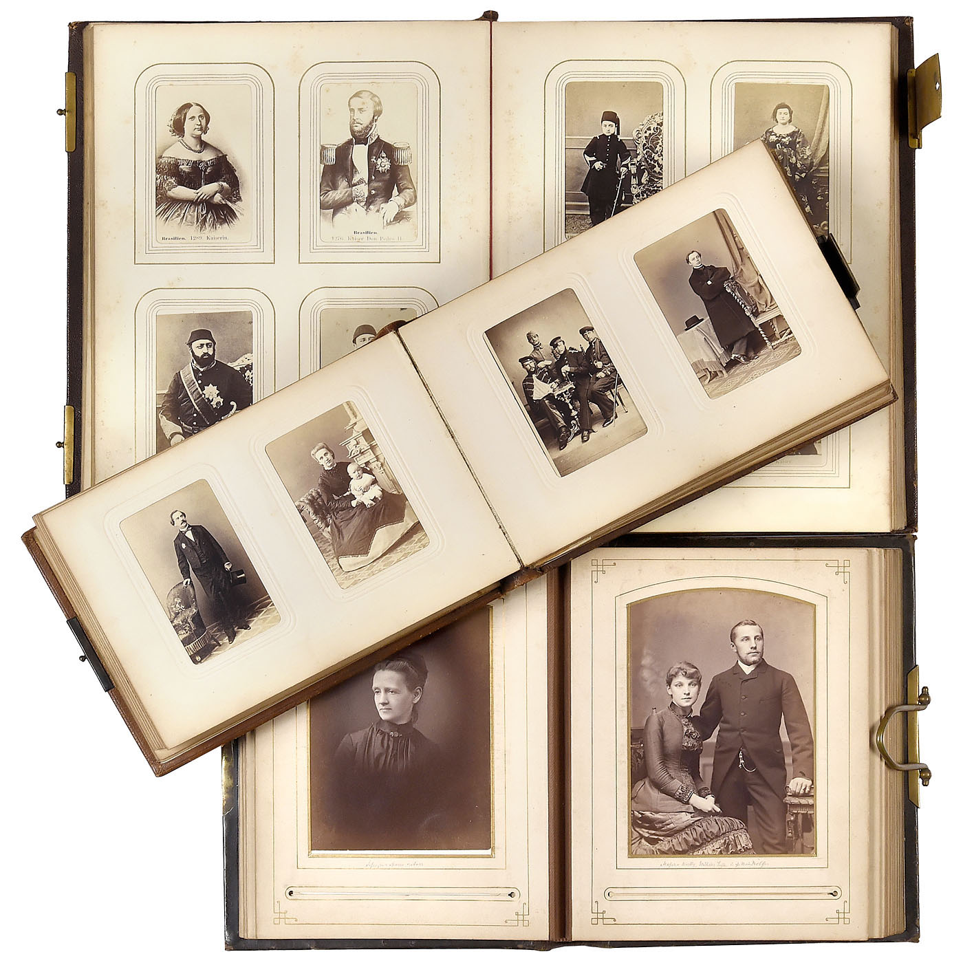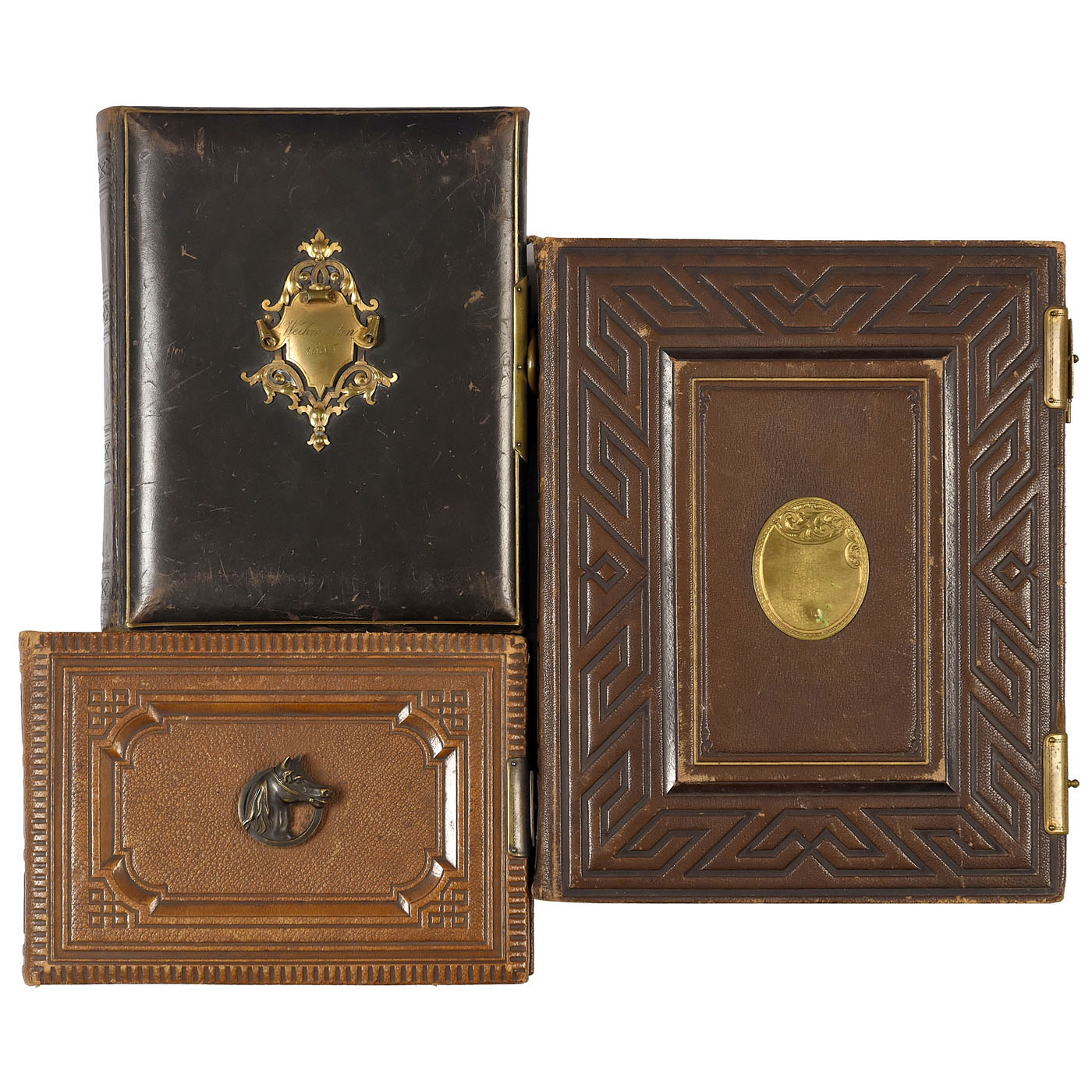 1) Carte-de-visite album, 21 x 15 cm with horse motif and clasp, 25 plates for 100 cartes de visite, with 99 mostly Russian images from 1864–1880 of the upper classes, two pages roughly re-glued, otherwise well-preserved, fairly clean image tone without staining. – Note: The same society lady is pictured in a series of images in Russia and later (on an Agfa-Lupex paper print from c. 1920) in reduced circumstances on the balcony of a rented apartment in exile. – 2) Leather album, 23 x 28 cm, with 25 plates for 200 cartes de visite, containing portraits of notable figures from the aristocracy, cultural life and politics, final page torn, clasp missing. – Note: The type of name printed on the lower edge of almost all the portraits suggests the sample album of a Russian dealer for pictures of personalities. As a rule, carte-de-visite albums containing pictures of prominent people or relatives in politics or from the nobility served the social purpose of discreetly familiarizing the waiting guest with the likes (who is shown) and dislikes (who is not) of the host. This is not such an album as all tastes are represented. – And: 3) Leather album "Christmas 1885", 17 x 22 cm, with 17 plates for cabinet format and complete set of 34 cabinet cards of German-speaking families, several labeled, including von Auer, Gutbier, Wagner and others (some photos by Ch. Bergamasco, St. Petersburg), including 12 cabinet cards of St. Petersburg.