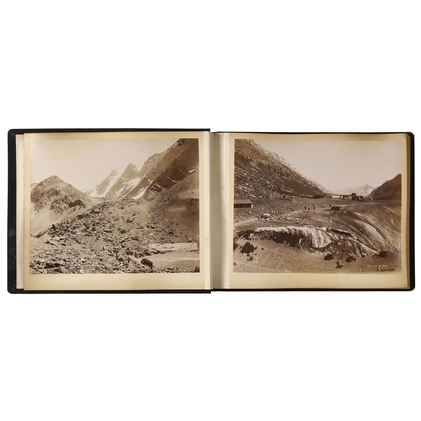 35 x 26 cm, with rayskin covers, 25 removable plates with 50 albumen images of 10 ½ x 8 ½ in., motifs from South America, several with text embedded in the image, without mention of the photographer, image tone well-preserved, rare travel photographs. Motifs include Valle del Inca, Rio Aconcagua, El Hito, scenes from the high mountains of the Andes, Cacheuta, Concepcion, Talcahuano, beach scenes, the castle Castillo Lota, Valdivia and 18 photographs of inhabitants.