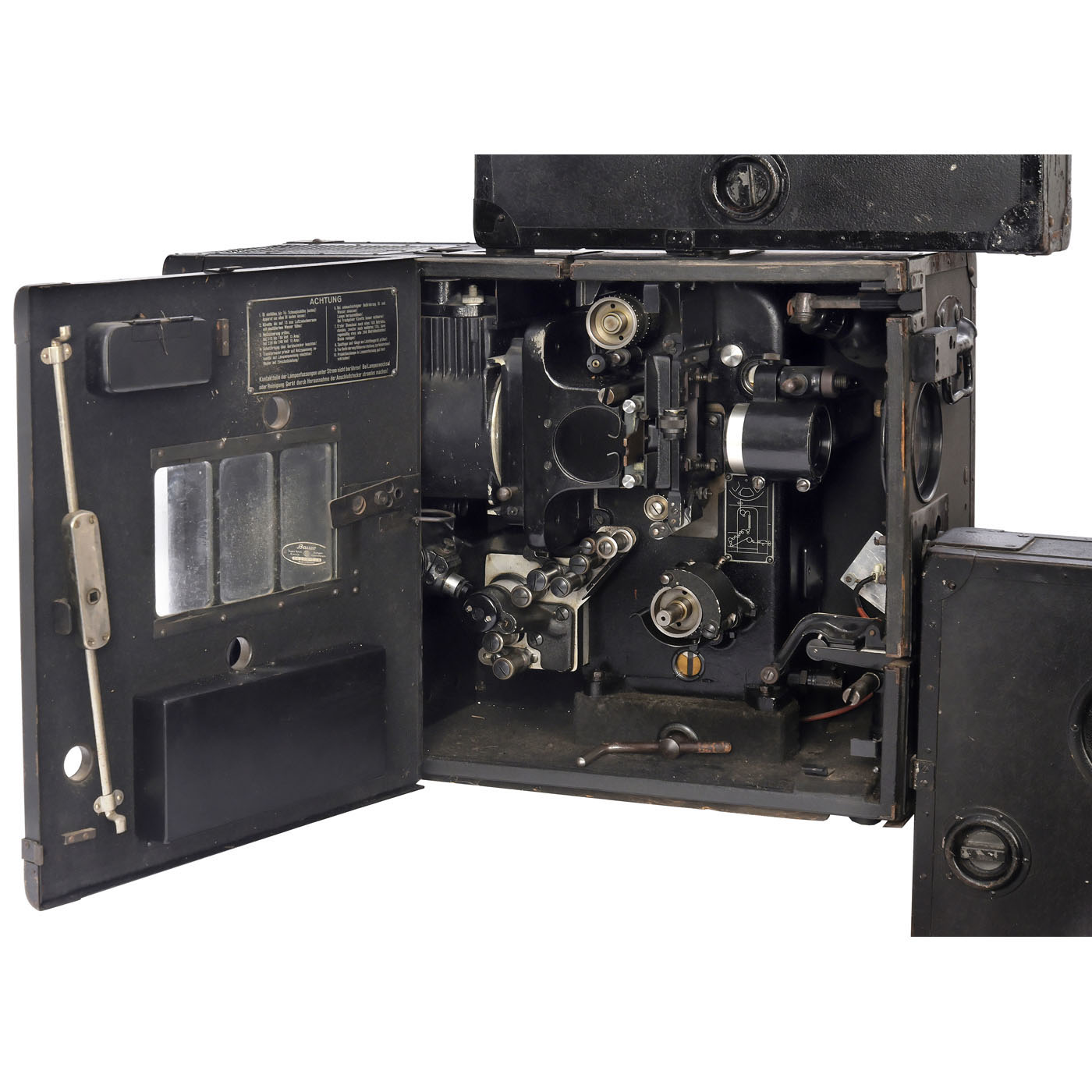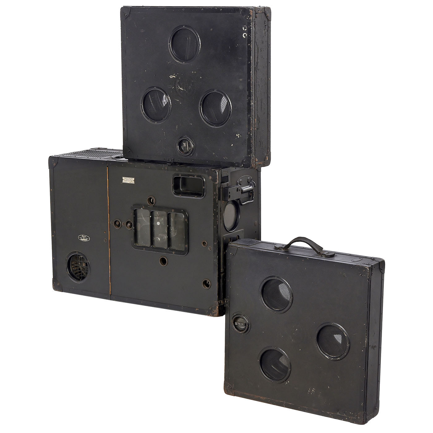 Eugen Bauer, Stuttgart. Portable projector for 35mm cinema films in fireproof drums on reels of up to 900 m long, with Isco Göttingen 1:2/90 mm lens, electric motor in imitation leather-covered case, sturdy film transport from a Bauer cinema projector with separate optical sound scanning and water-filled cuvette between the lamp housing and the film track to reduce the risk of fire from nitrocellulose film (Class B) of the period, basic working condition, with 600-meter Bauer reel in each protection drum. – Note: The projector is started via the existing plug-in crank to protect the film. In the original version, this traveling cinema came with a 20 kg transformer. To replace this, the projector, which was still in use until a few years ago, was converted to 220-volt/1,000-watt halogen lamps. Unveiled at the Leipzig Autumn Fair in 1938, by 1945 almost 1800 of these projectors had been delivered to the Wehrmacht for its troop cinemas. In the post-war years, traveling cinema operators often used "Sonoluxes" to show the latest films in remote villages. After 1948, Bauer is said to have briefly produced a few "Sonolux II" devices.