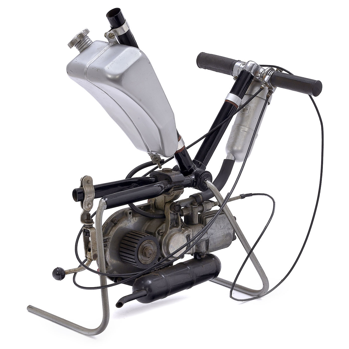 Hermann Teegen, Lohmann-Werke AG, Hamburg. Single-cylinder two-stroke engine, 18 ccm, suitable for various fuels from diesel to paraffin, 0.6 kW, power transmission with friction roller on rear wheel, untested, on stand, with French manual.