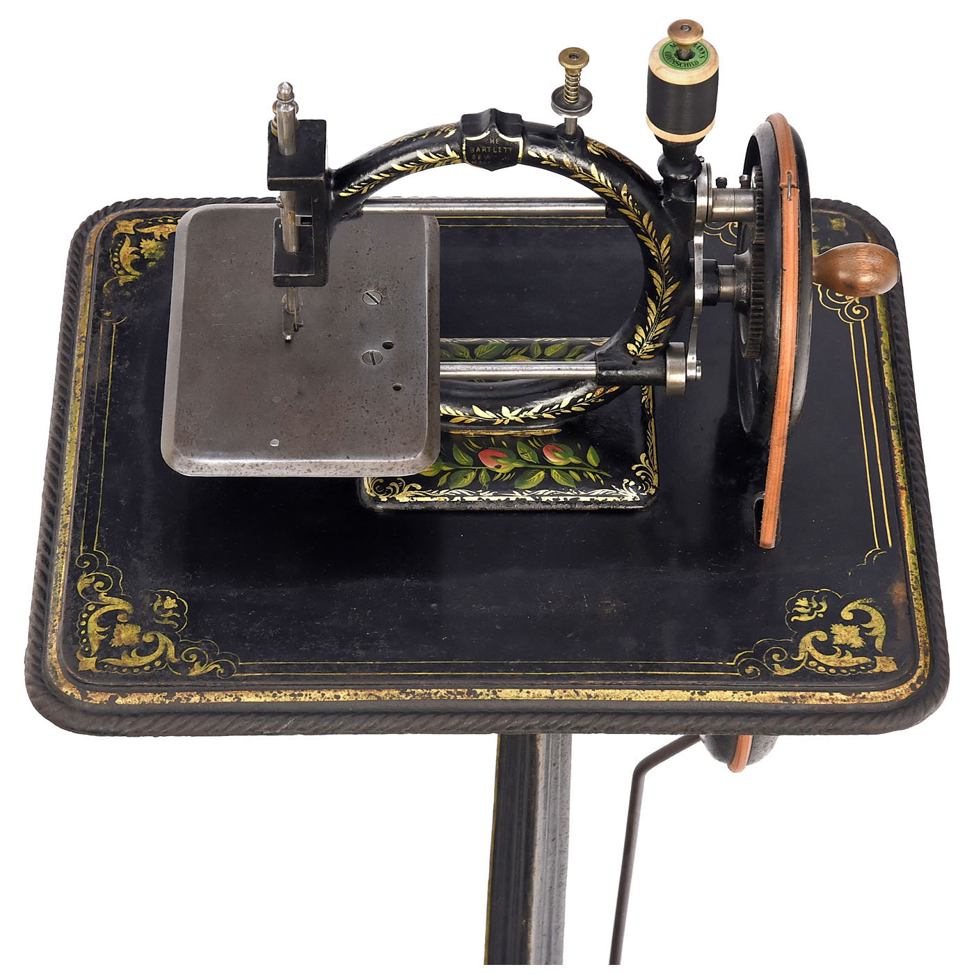 Bartlett SMCo., New York, USA. Retailed in France. On a French tripod, cast iron without cracks or breaks, attractive original decoration, complete with looper and needle, smooth running.