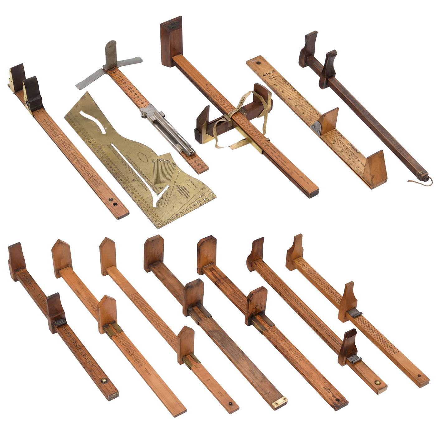 1) Boxwood and brass, England, France or the United States, by Dr. Scholl, Peccolon, Babone & Sons, Whitcher Co., U.W.W. Co., L. Madieu, Pin-It, Barnsley & Sons and others. – And: 2) Brass, "Modellwinkel" (model drawing device), length 15 ½ in.