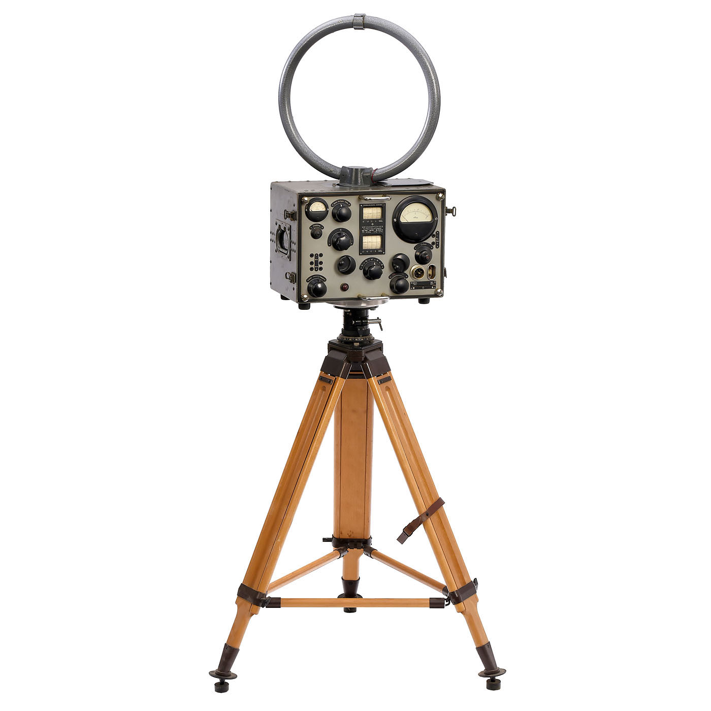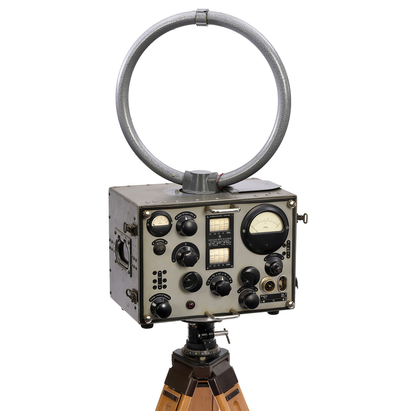Physikalisch-Technisches Entwicklungslabor Dr. Rohde & Dr. Schwarz, Munich, 9 tubes, 2.5–25 MHz in four sub-ranges, built-in calibration transmitter, with manual, attached frame antenna and tripod.