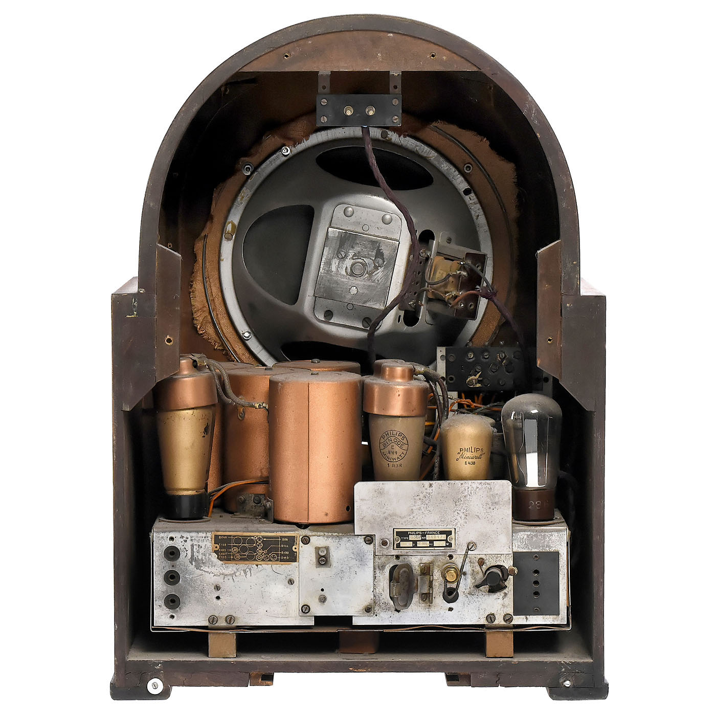 Philips France. Super Inductance, eight tubes, long wave and medium wave, mains operation, dynamic loudspeaker, cathedral-type wood case, complete with tubes and rare panel, very good condition and, according to the consignor, in working order.