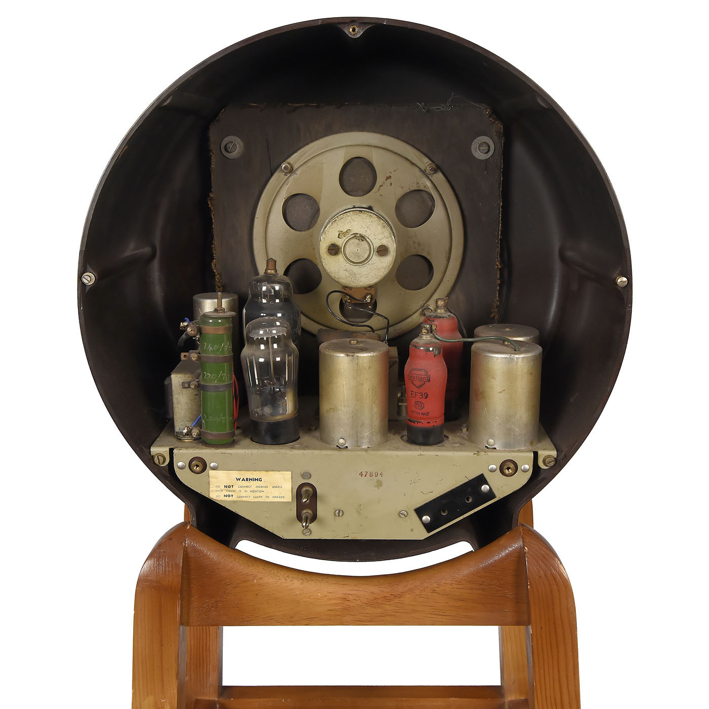 Ekco, E.K. Cole Ltd., Southend-on-Sea, England. 4 tubes, three wave ranges, 200–250 volts AC, dynamic speaker, round bakelite case in very good condition, complete with tubes and rear panel, according to the consignor in working order, on original Ekco floor wood stand.