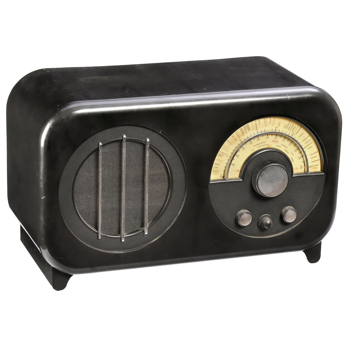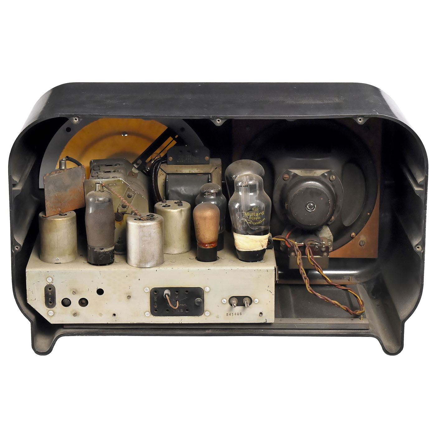 E.K. Cole Ltd., Southend-on-Sea, England. 6 tubes, long wave and medium wave, 200–250 volts AC, integrated loudspeaker, black bakelite case in good condition, complete with all components and rear panel.