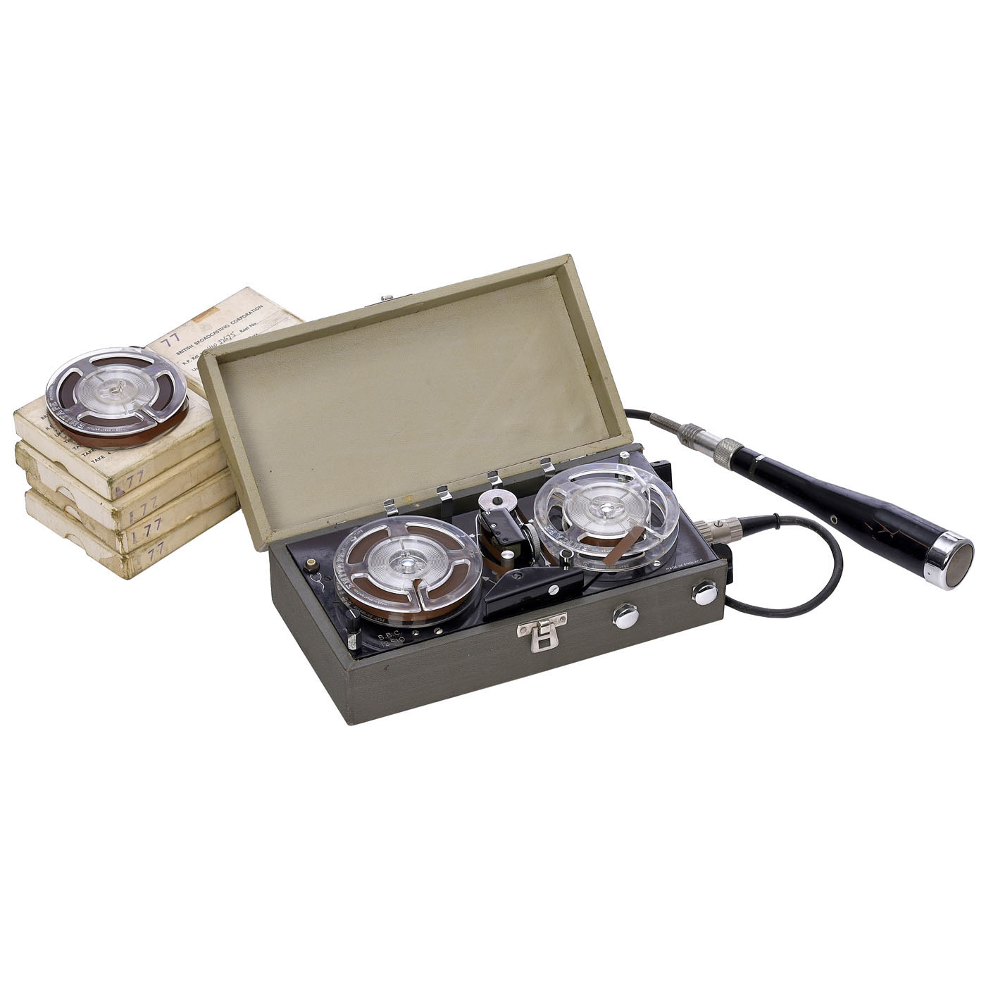 Erskine Laboratories in Scarborough, England, under licence from Quellet-Stellavox Switzerland. BBC reporter’s tape recorder, powered by four lead-acid batteries with a voltage of 2 volts each, for 3.5-inch tapes, play/record at 1 7/8 or 7 ½ ips, internal speaker and headphone jack, with nine Emitapes and Grampian DP4/M microphone, untested.