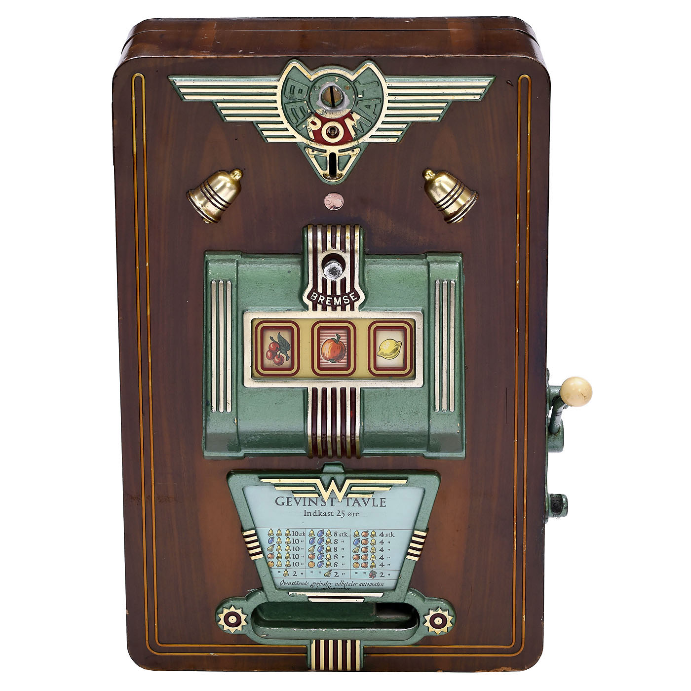 Günter Wulff Apparatebau. Mechanical slot machine, lever-operated, 5-Euro-Cent stake, maximum win 50 Cent, three turning reels, Danish winning list, good and complete condition, works, missing cash box, with key.