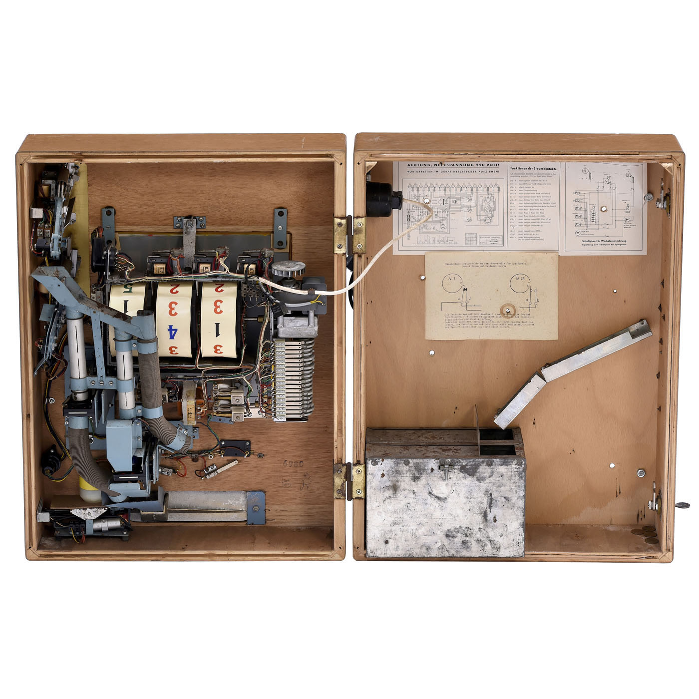 Busch & Co, Hellenthal. Electromechanical slot machine, 10-pfennig stake, maximum win 1 deutschmark, money changer, three turning reels, good and complete condition, works, with key.
