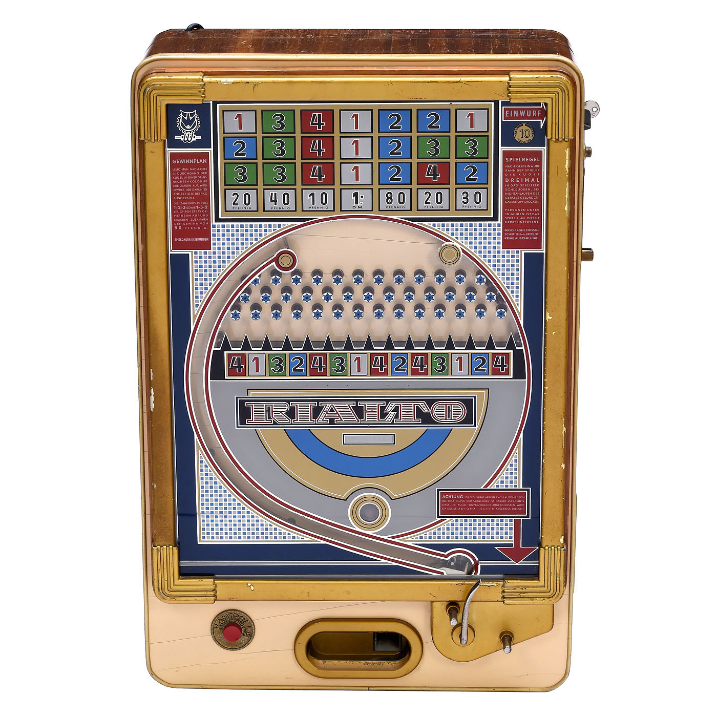 Günter Wulff Apparatebau. Electromechanical slot machine, 10-pfennig stake, maximum win 1 deutschmark, ball-flipping game, good and complete condition, works, with two keys.