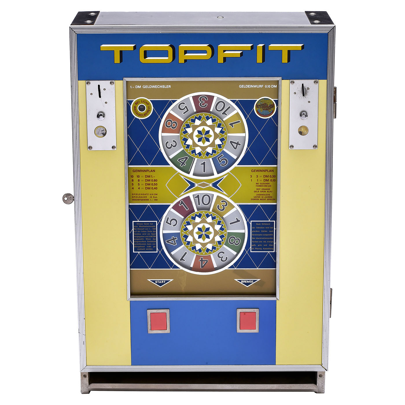 Bergmann, Hamburg. Electromechanical slot machine, 5-Euro-Cent stake, maximum win 50 Cent, two turning wheels, works, with two keys.