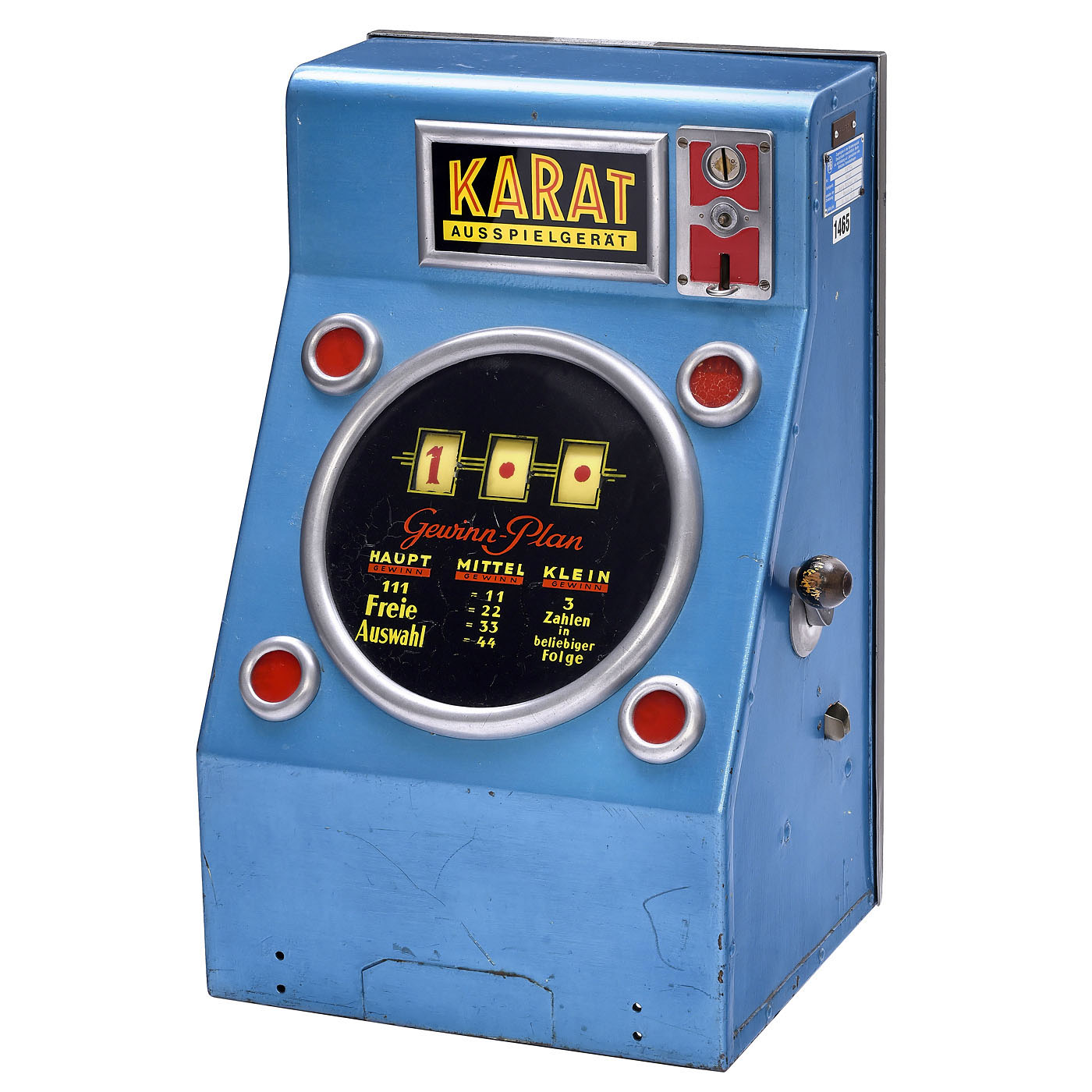 Brückel Apparatebau. 10-pfennig stake, win 1 token, three turning reels, mechanical, crank-operated, good and complete condition, works, with key.