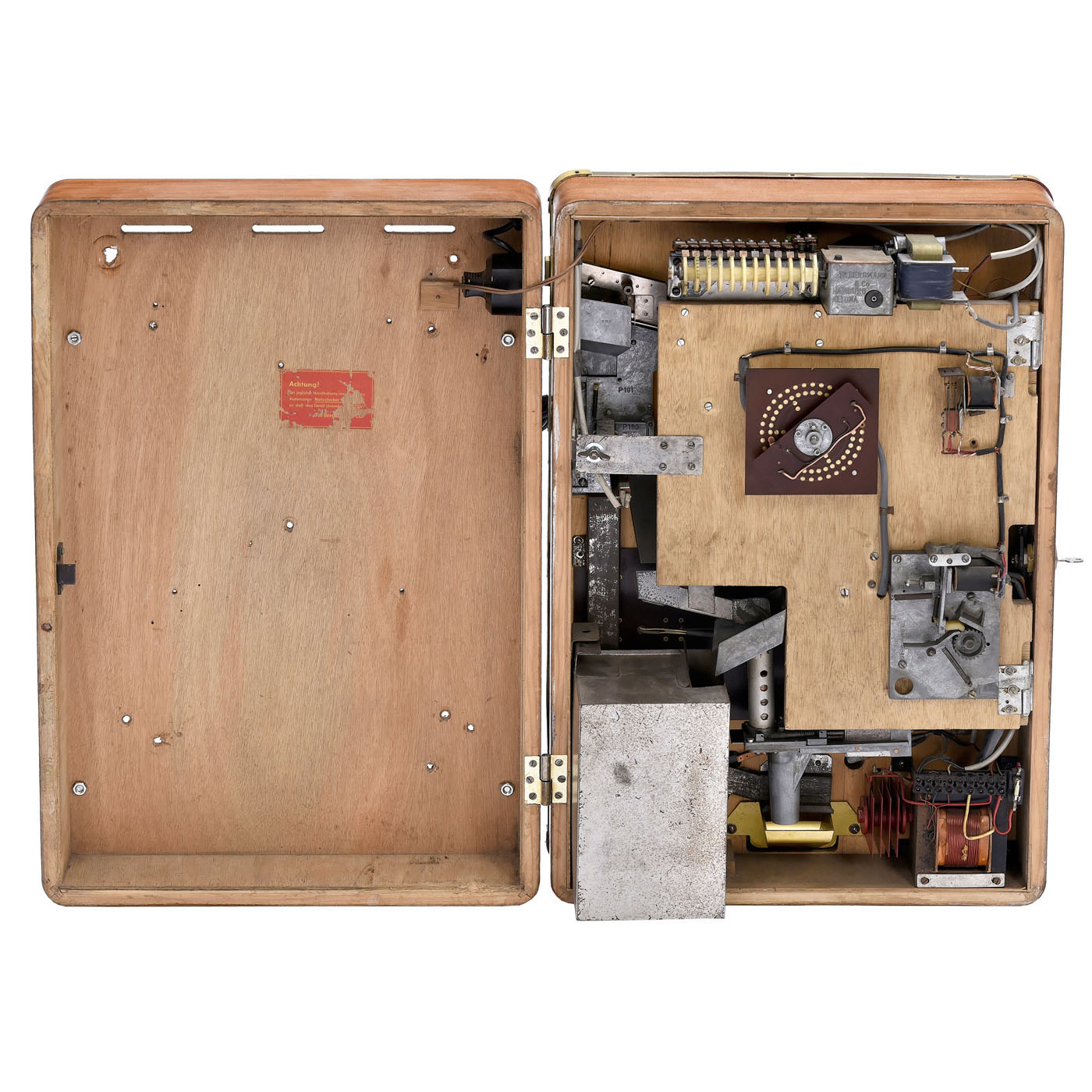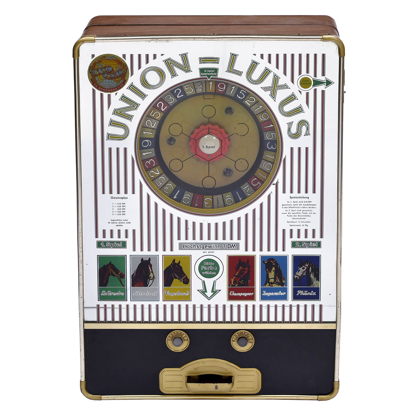 Bergmann, Hamburg. Electromechanical slot machine, 10-pfennig stake, maximum win 1 deutschmark, one turning roulette disc, good and complete condition, works, with key.