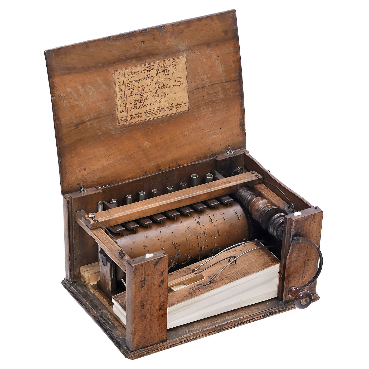 Germany. Playing 6 airs, with hand-turned nine-note mechanism, metal pipes, walnut case, handwritten original tune-sheet and maker's label in the lid: "von Johan Arnold a Pülsheim", 10 ¼ in. (26 cm) wide, good playing condition.
