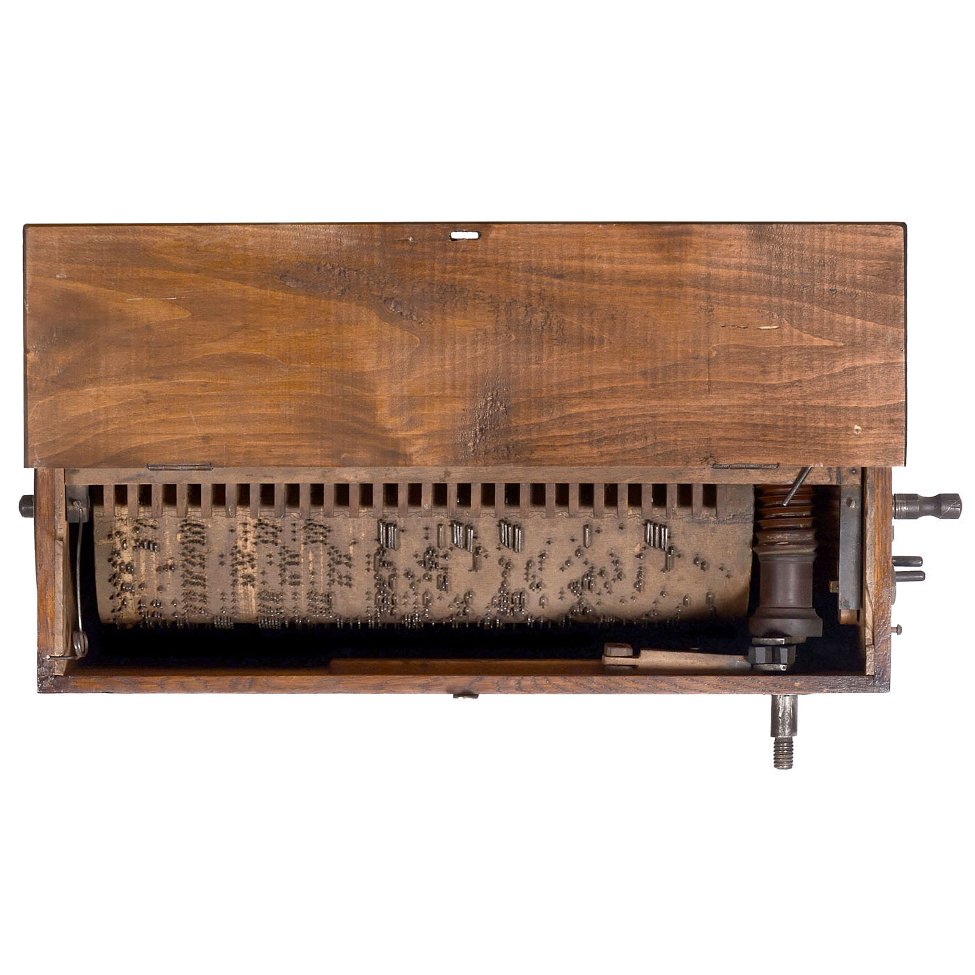 Unmarked, reed organ, with pinned wood barrel playing seven airs, 26 keys and fruitwood case, overall 19 1/3 x 10 1/5 x 18 ½ in., barrel 14 ½ in., lid and sound fret replaced, very good playing condition.