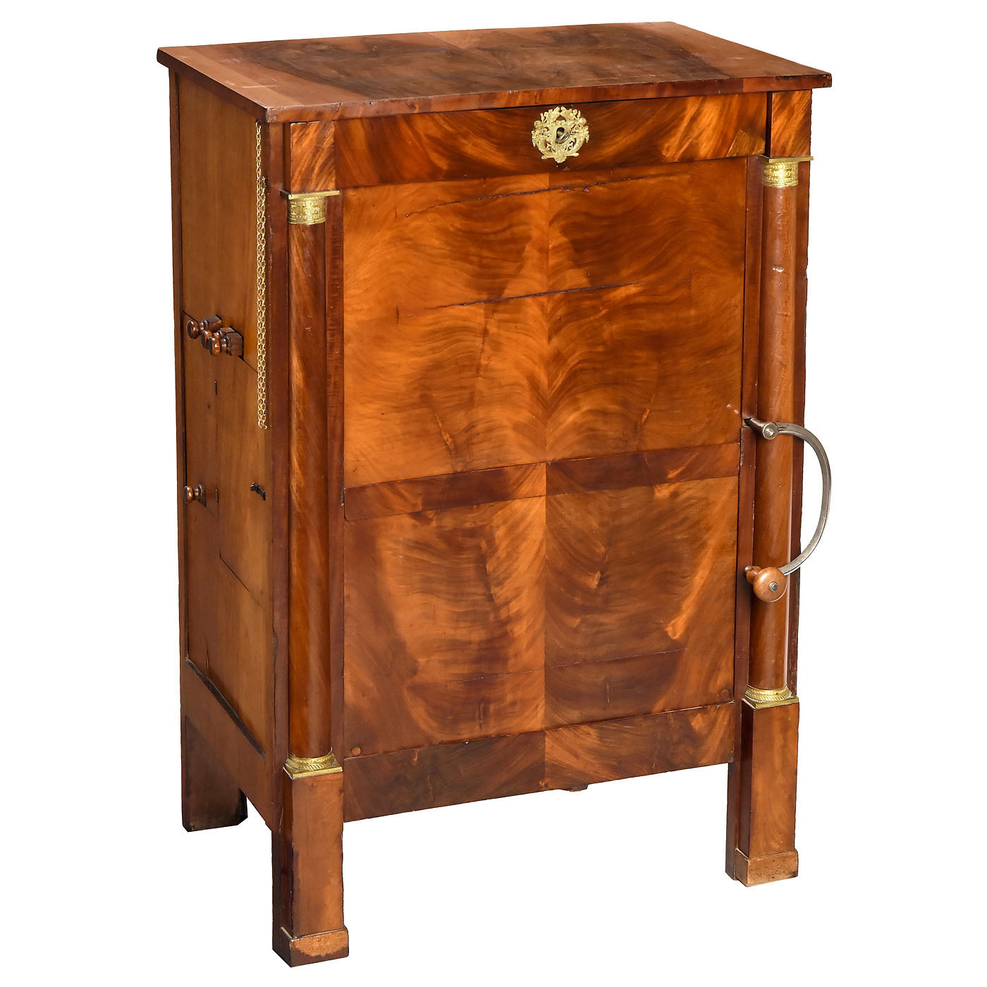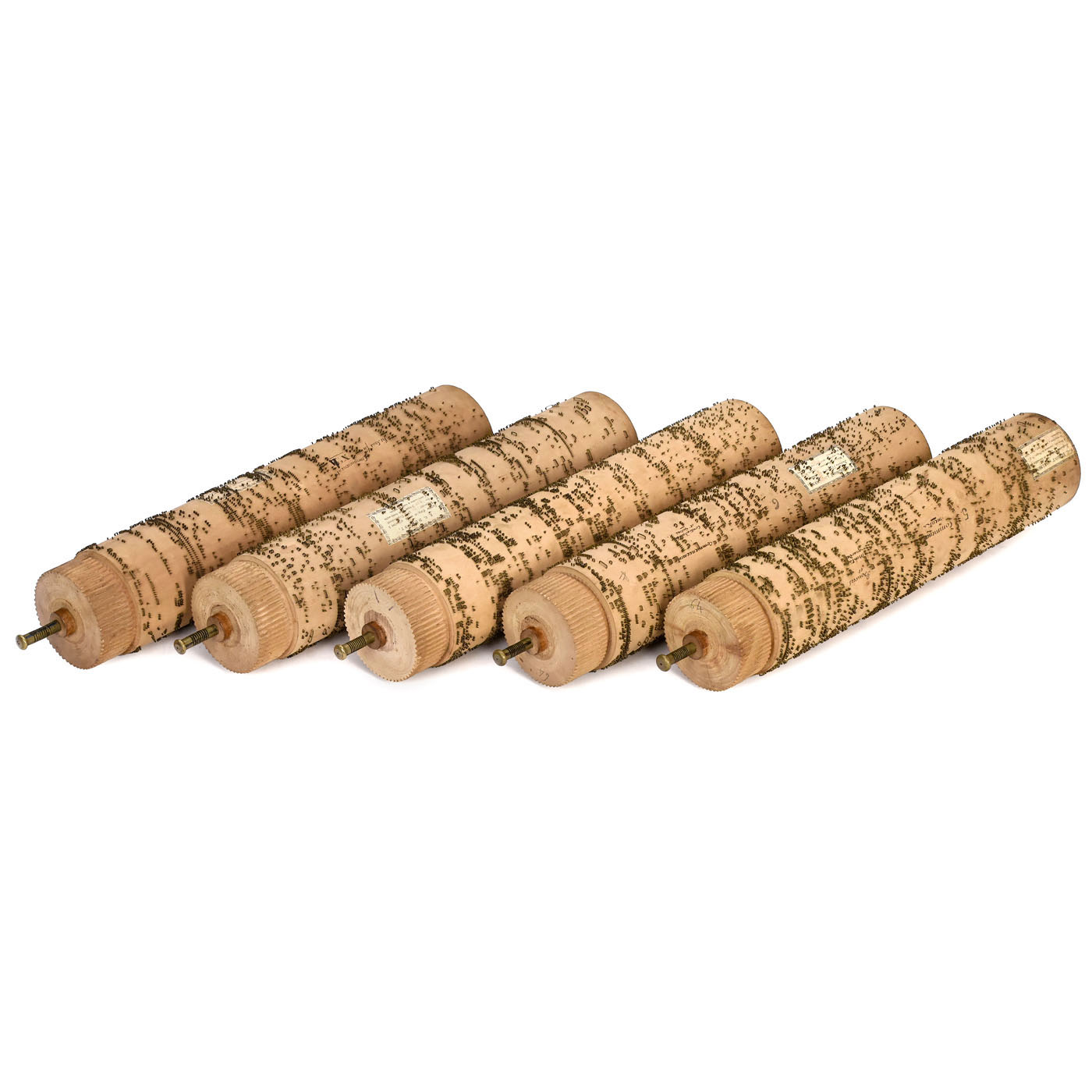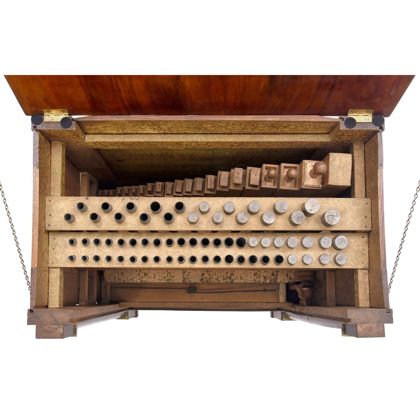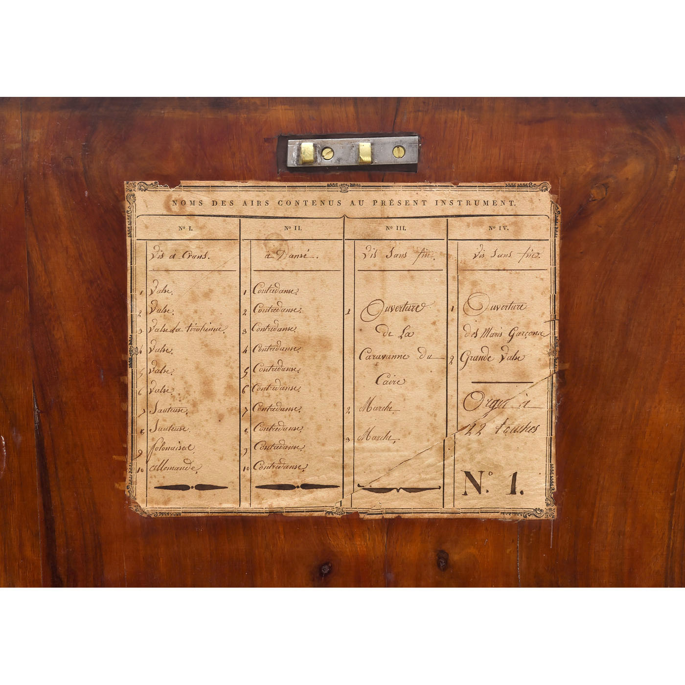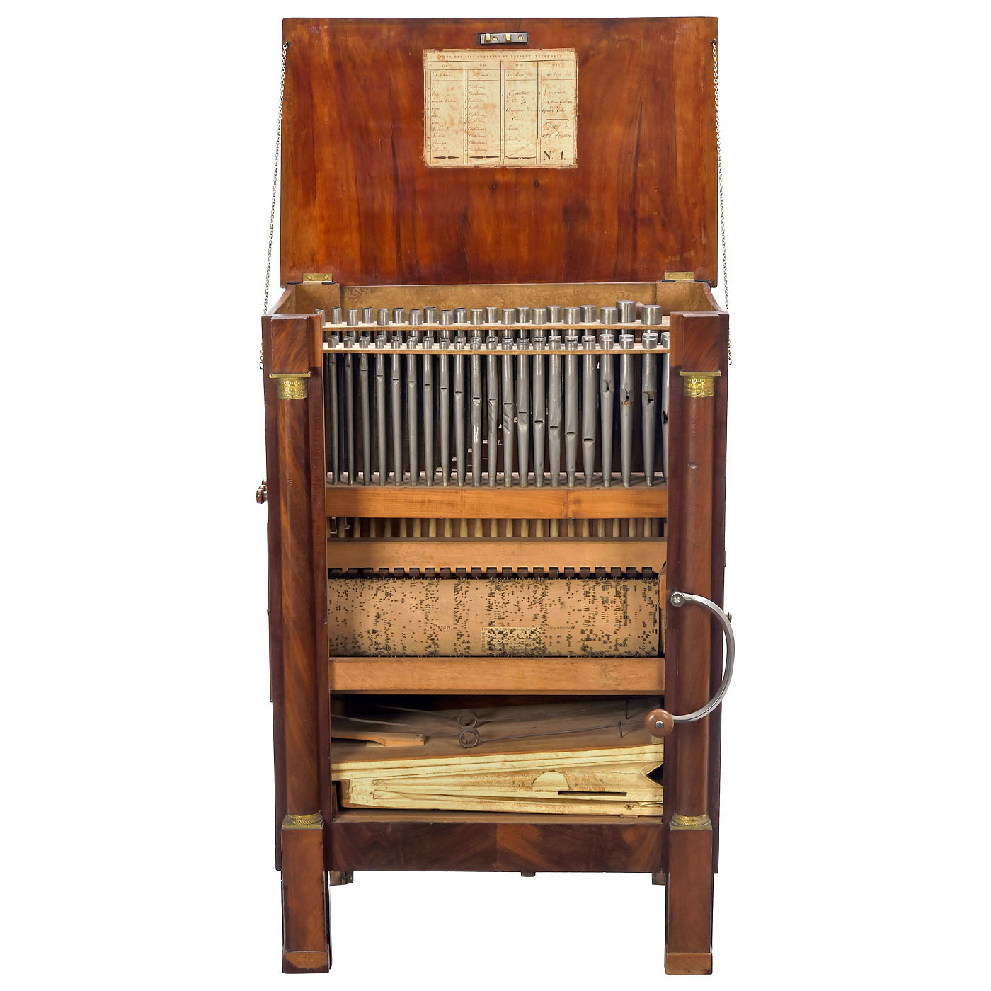 F.G. Dumont Facteur d'Orgues et de Serinettes à Mirecourt. With hand-turned movement, six pinned wood barrels, four playing ten airs, two with spiral pinning for longer compositions, 22 notes, 23 wood pipes, 65 metal pipes, three optional registers, fruitwood case and pilasters with brass bases and capitals, overall 28 x 17 x 41 in., barrels 21 in., restored in 1990 by Rudolph Winters à Chamalières and in 2015 by P. Desnoulez, Musée à Steenwerck, very good playing condition.