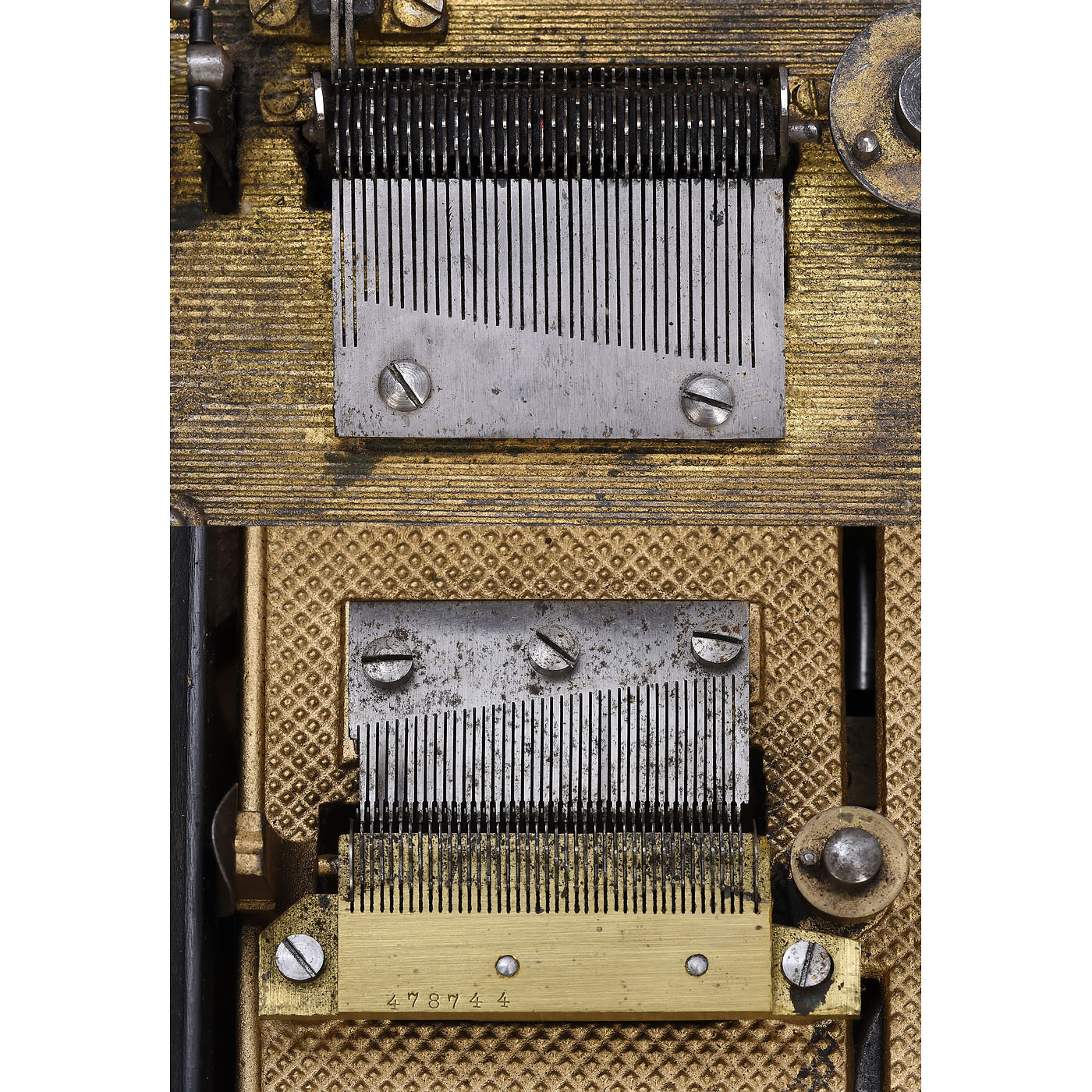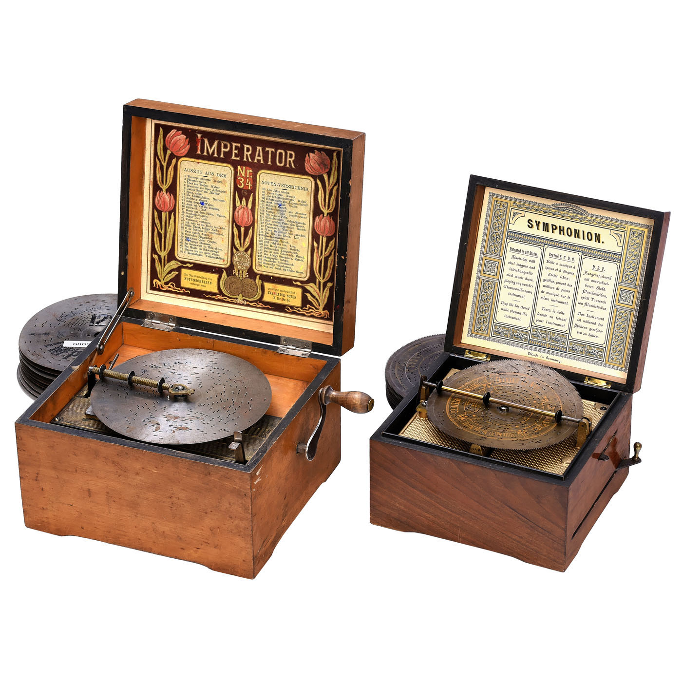 1) Imperator No. 34, Friedrich Adolf Richter & Cie, Rudolstadt in Thuringia, Germany. For 6 5/8-inch discs, with 34 teeth in steel comb (complete), accompanied by two optional bells, with 13 discs. – And: 2) Symphonion No. 28S Simplex, Leipzig. For 5 3/4-inch discs, with 40 teeth in steel comb (complete), lever-wound, polished walnut case, with 13 discs. – Both instruments in very good original playing condition.