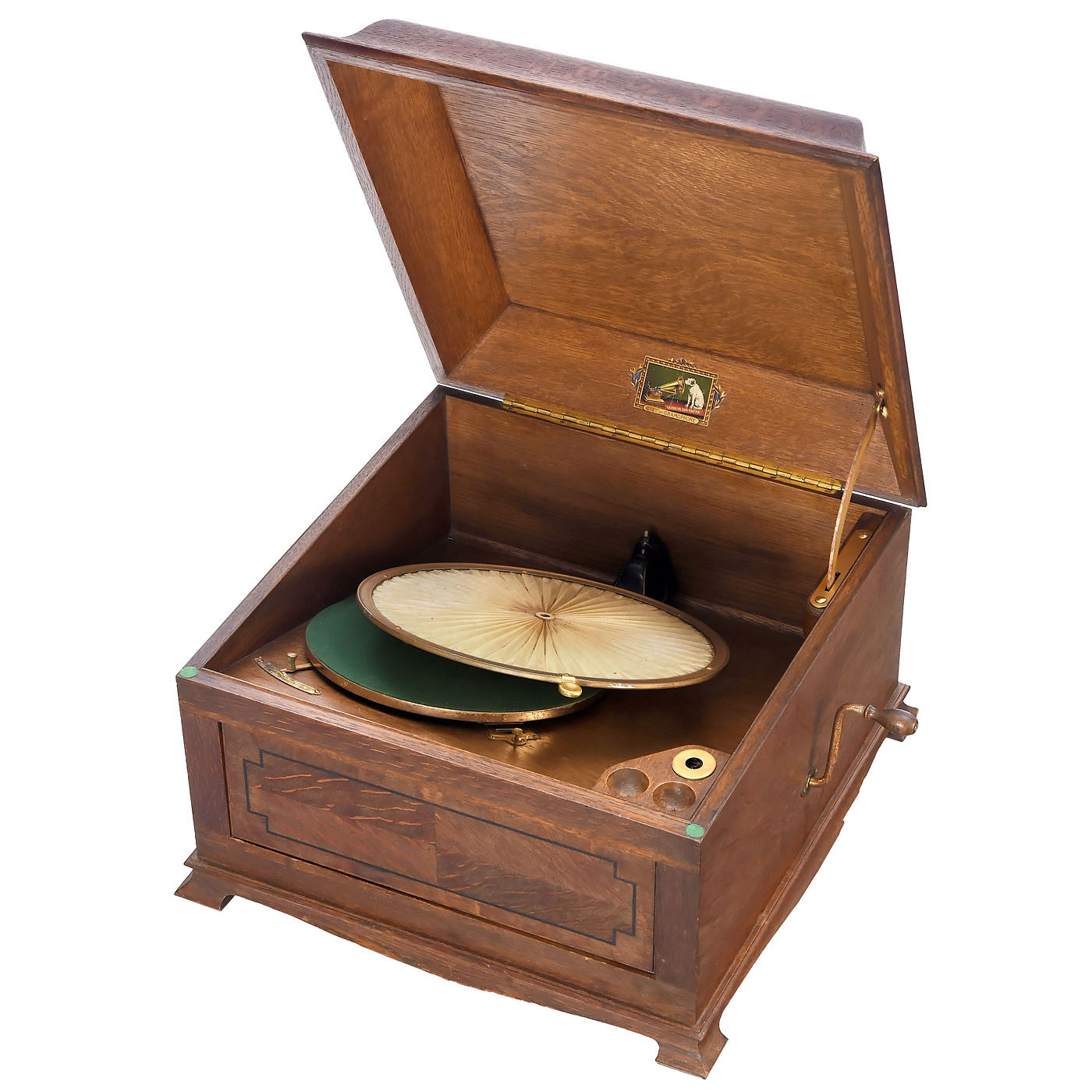 Made in England for the French market and imported by Cie. Fse. du Gramophone, Paris, with gilt metal parts, 12-inch turntable, horizontal pleated paper diaphragm, spring-drive, oak case with lid, good working condition and tone.