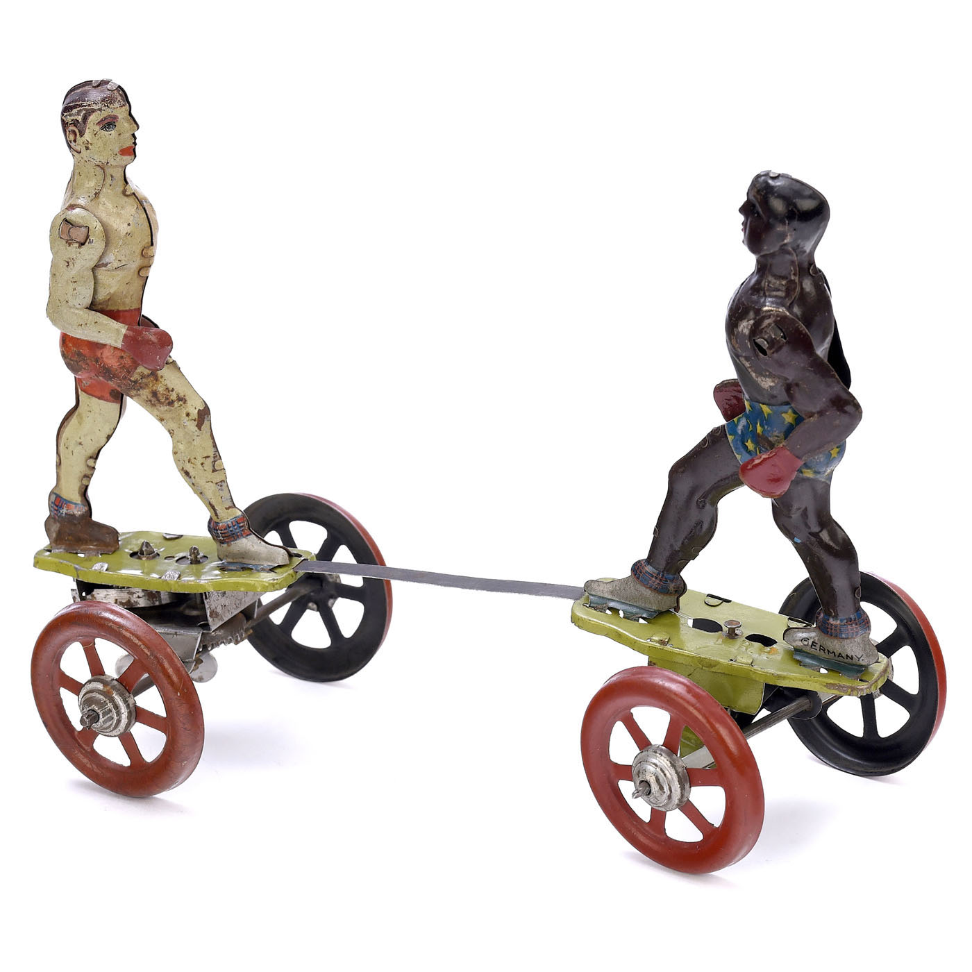 Gebrüder Einfalt Blechspielwarenfabrik, Nuremberg (later Technofix). Catalog no. 115, lithographed tin, clockwork (works), with one black and one white boxer, length 7 1/2 in.
