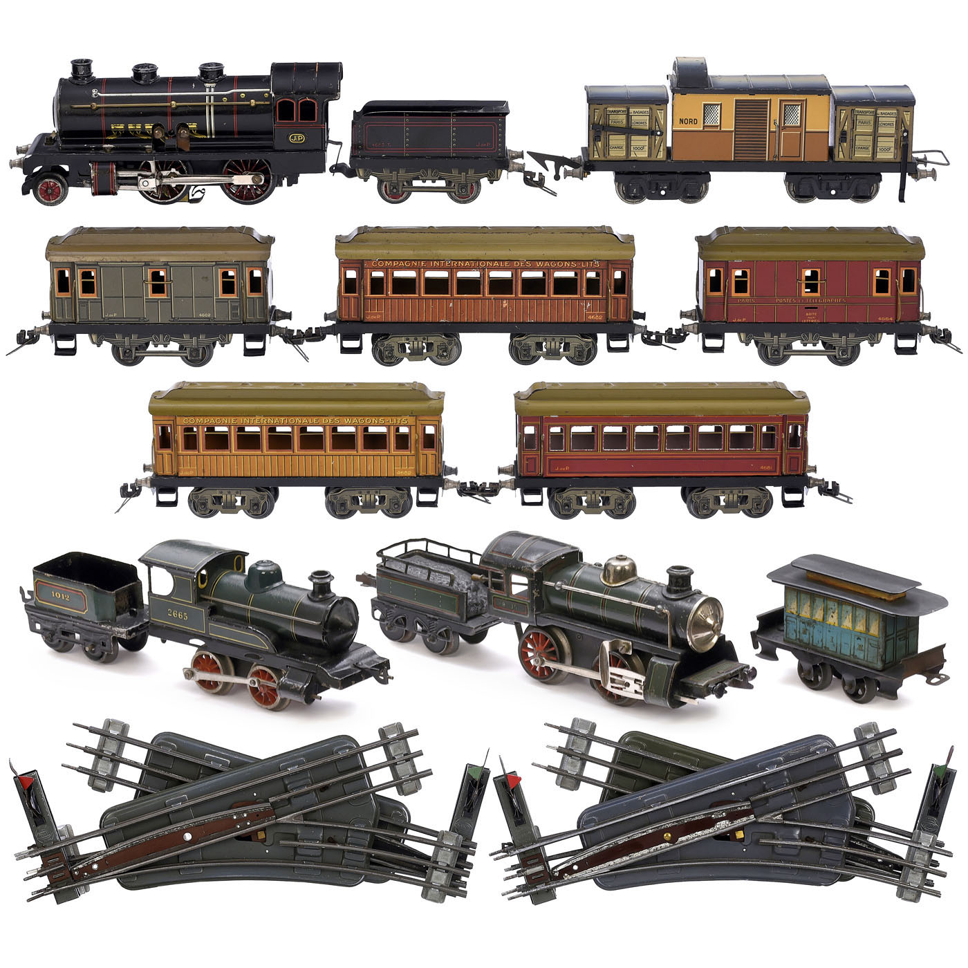 1) JEP steam locomotive with 6 carriages and switches, c. 1930, France, lithographed tin, tender locomotive, electric, 1 headlamp, length with tender 15 ¾ in., untested, baggage car, no 5475.B, opening doors, length 10 ½ in., 2 x Compagnie Internationale des Wagons-Lits, no. 4682, length 9 ½ in., passenger car, no. 4681, length 9 ½ in., mail coach, no. 4664, length 7 in., baggage car, no 4662, length 7 in., 4 manual switches, in boxes. – And: 2) 2 steam locomotives and a coach, c.1935, Bing Werke, Nuremberg, no. 2665, reversible, length with tender 10 in., good working condition, Karl Bub, Nuremberg, reversible, length with tender 10 5/8 in., spring mechanism somewhat weak, passenger coach, unmarked, probably France, length 4 1/3 in.