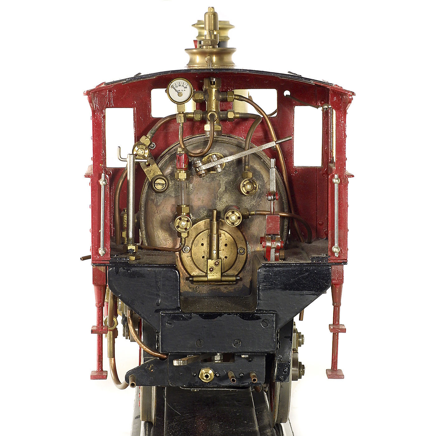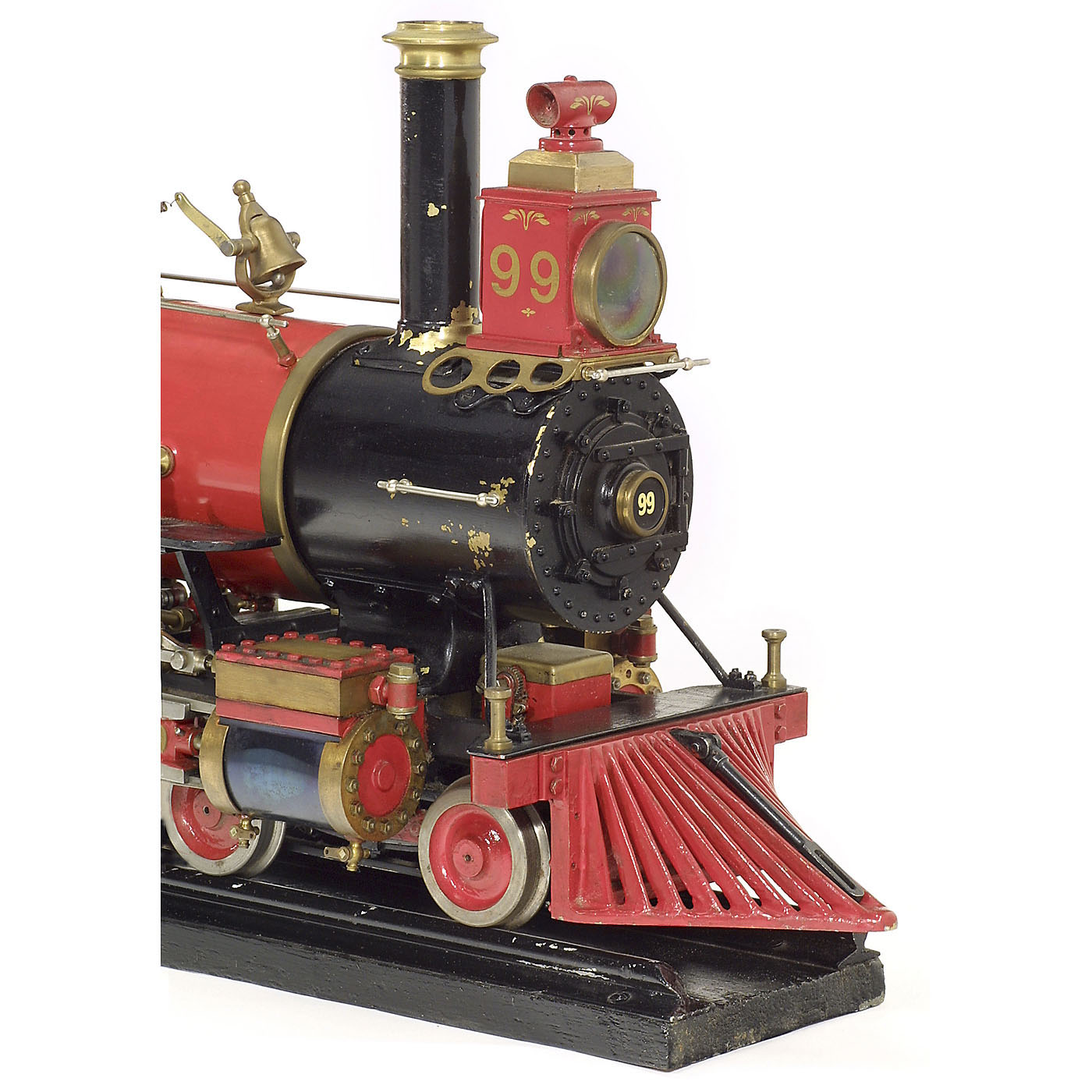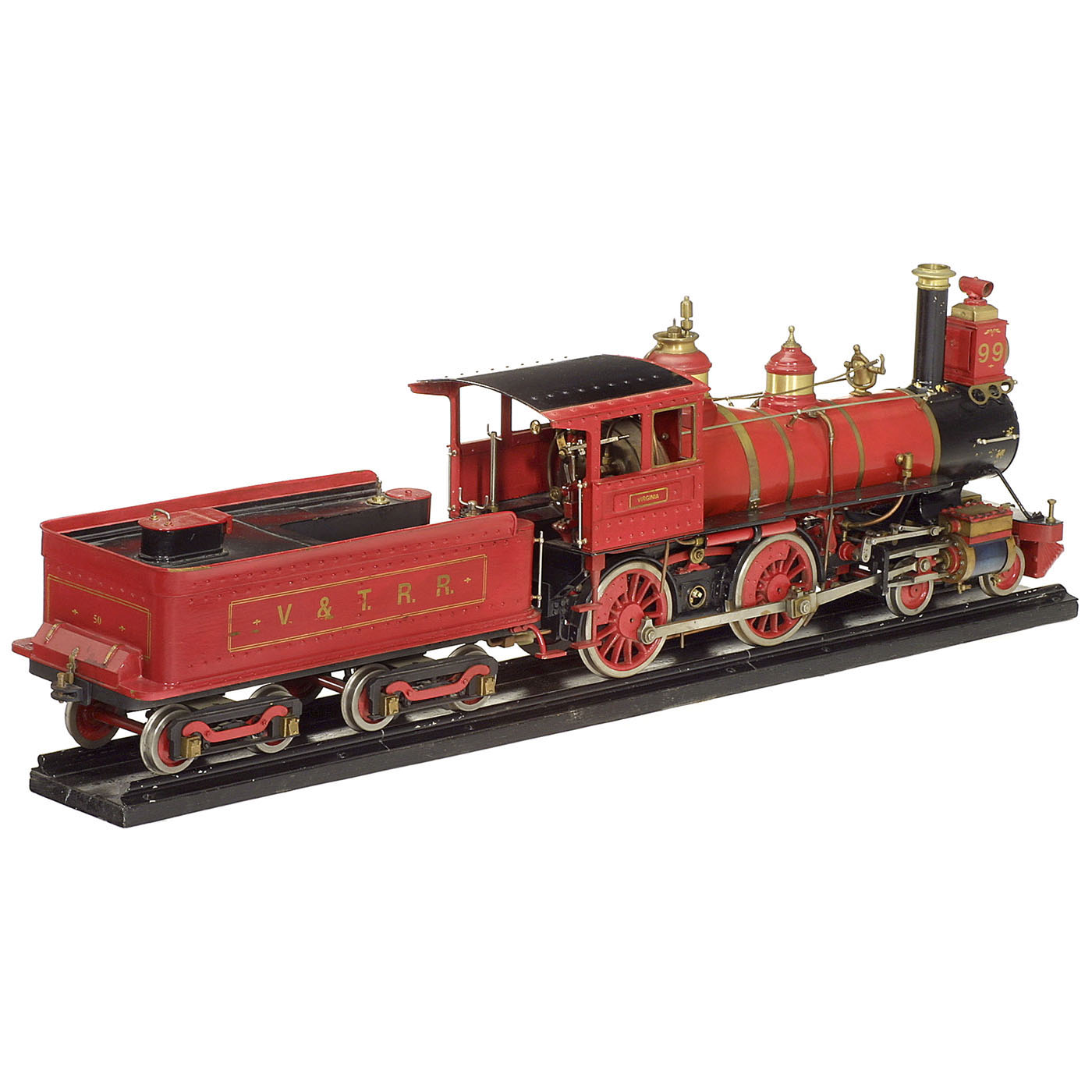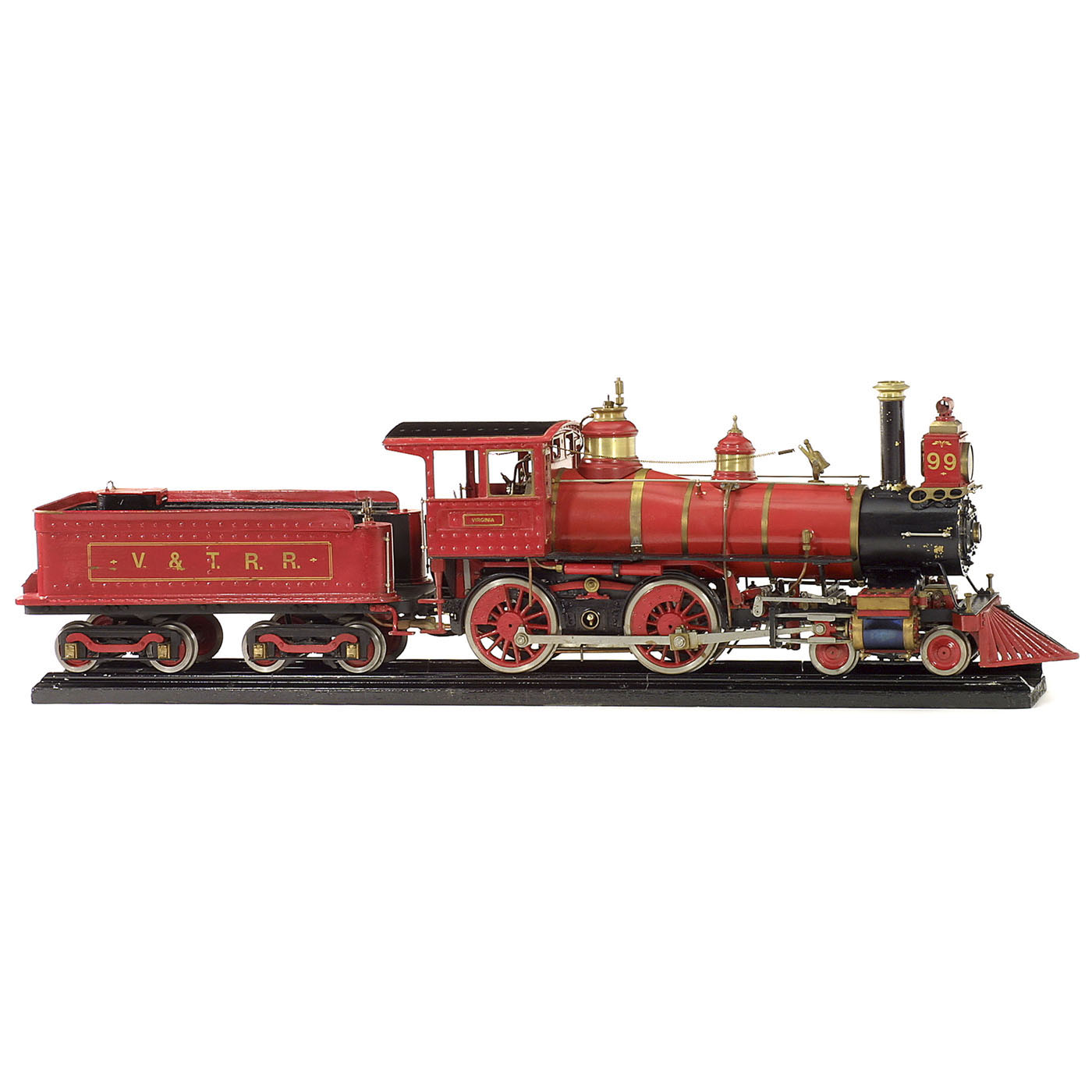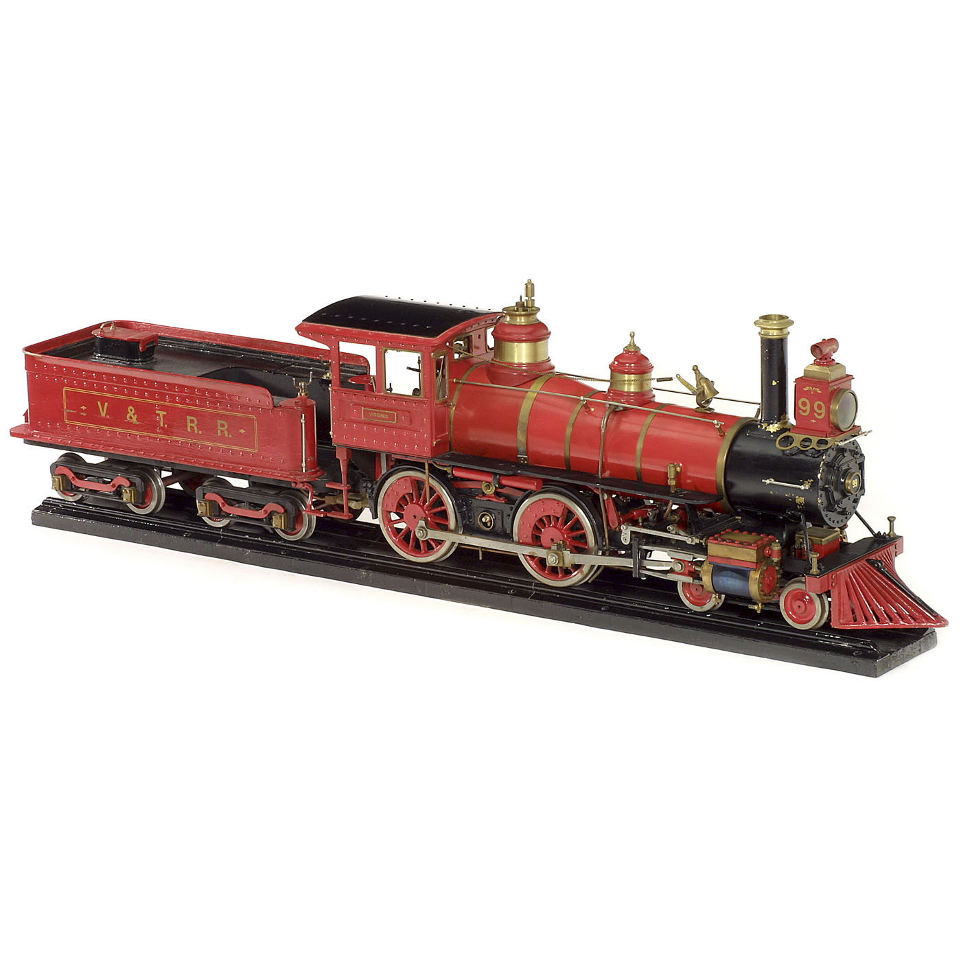 A finely engineered 3 ½ in. gauge model of the North American wood-burning locomotive "Virginia" from 1865 with tender (Baldwin type 4–4–0), chassis frame with twin external cylinders, interior with Stephenson's link reserve, valve chest lubricators, dummy leaf springs, pipework, cow-catcher, headlamp, bell, sandbox, whistle, unglazed cab and other details, twin-bogey sprung tender with water cocks and rivets, finished in red and black with polished brass work, on show track, 45 in. long. – Museum quality.