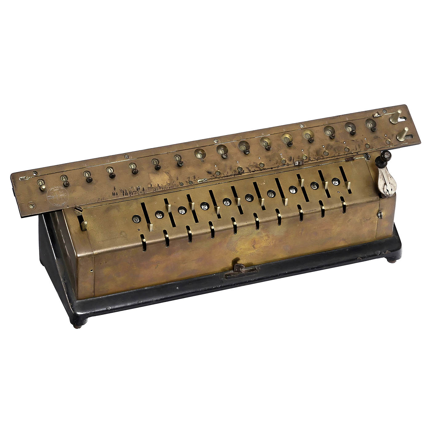 1) "TIM Mod. IV" (Time Is Money), 1909, stepped-drum calculating machine by Ludwig Spitz, Berlin. No. 02242. With 10, 9 and 16 digits. – Literature: Martin, p. 202. – Partially working, more suitable as a source of spare parts. (4/4-) – And: 2) Bunzel-Delton No. 5, c. 1920, Bunzel-Delton Werk, Vienna. No. 8248, unusual, sought-after stepped-drum machine with 7, 7 and 12 digits, in working condition. (3/3–4)