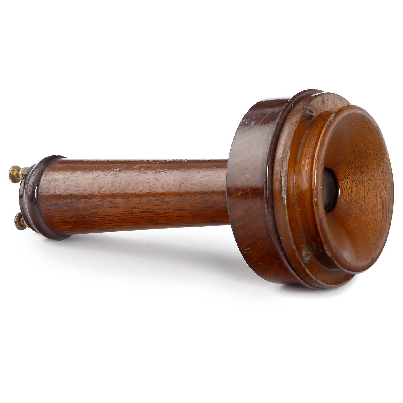 Unmarked, turned mahogany, height 6 ¾ in., with two external terminals.