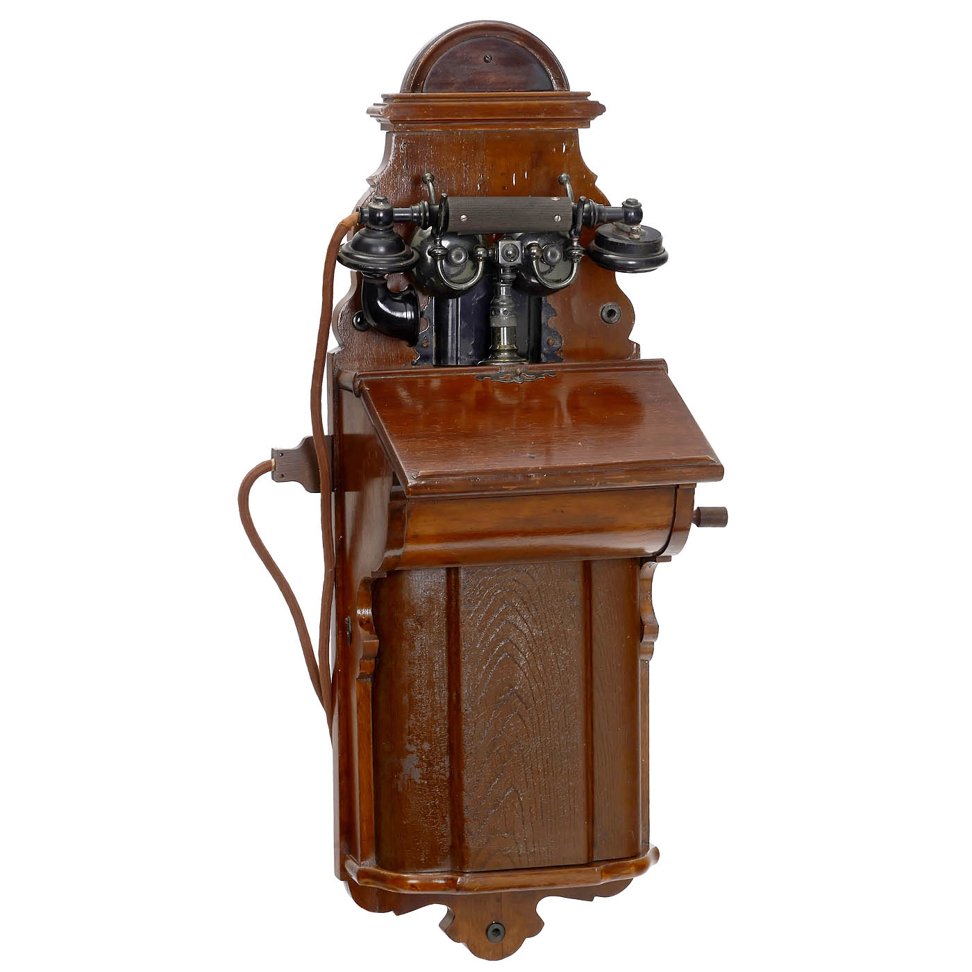 British L.M. Ericsson Mfg. Co., Beeston. Type NT2, no. 59, with wood case, four-part induction coil, double bell and handset with horn microphone. – Good original condition.